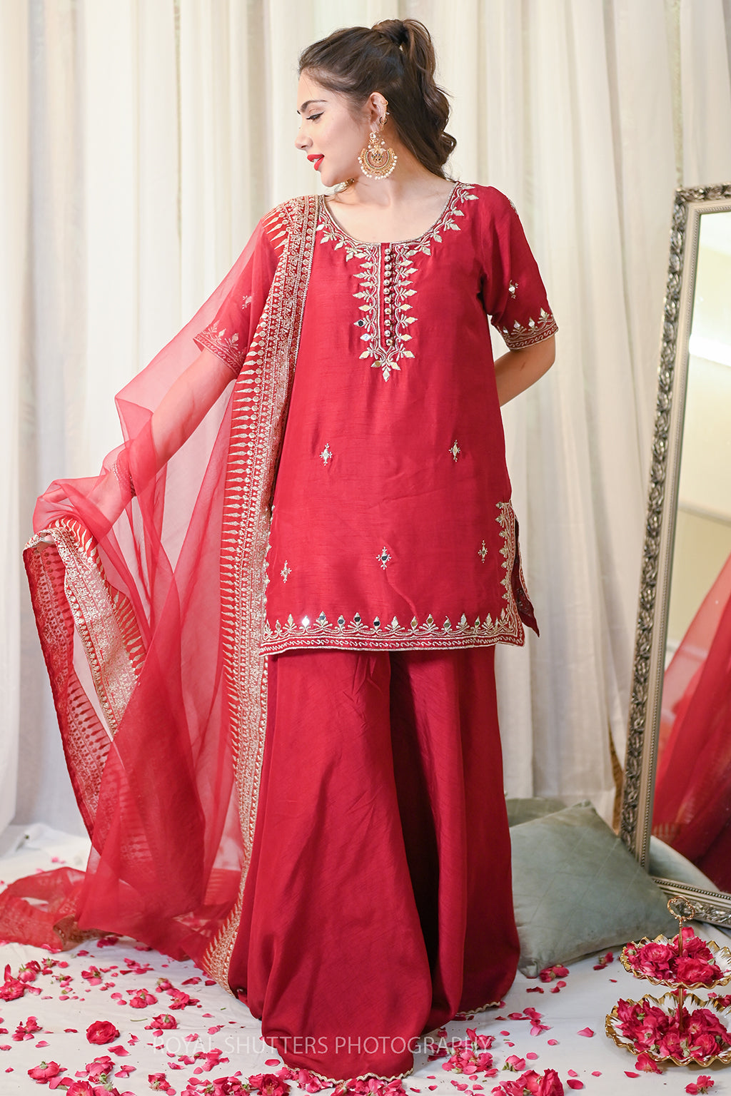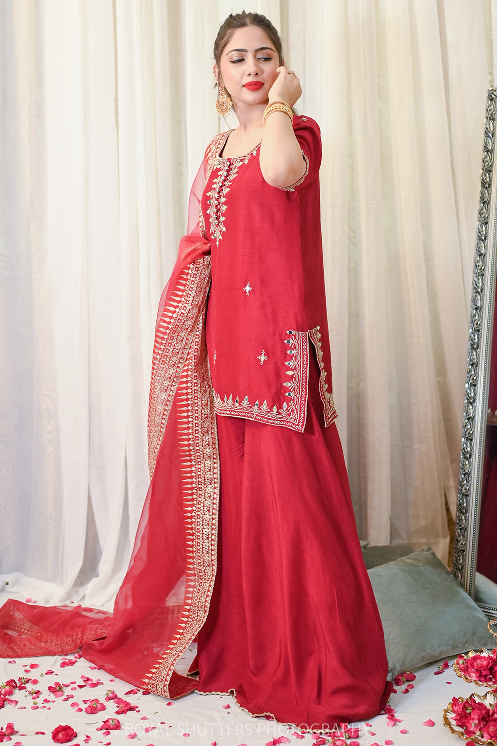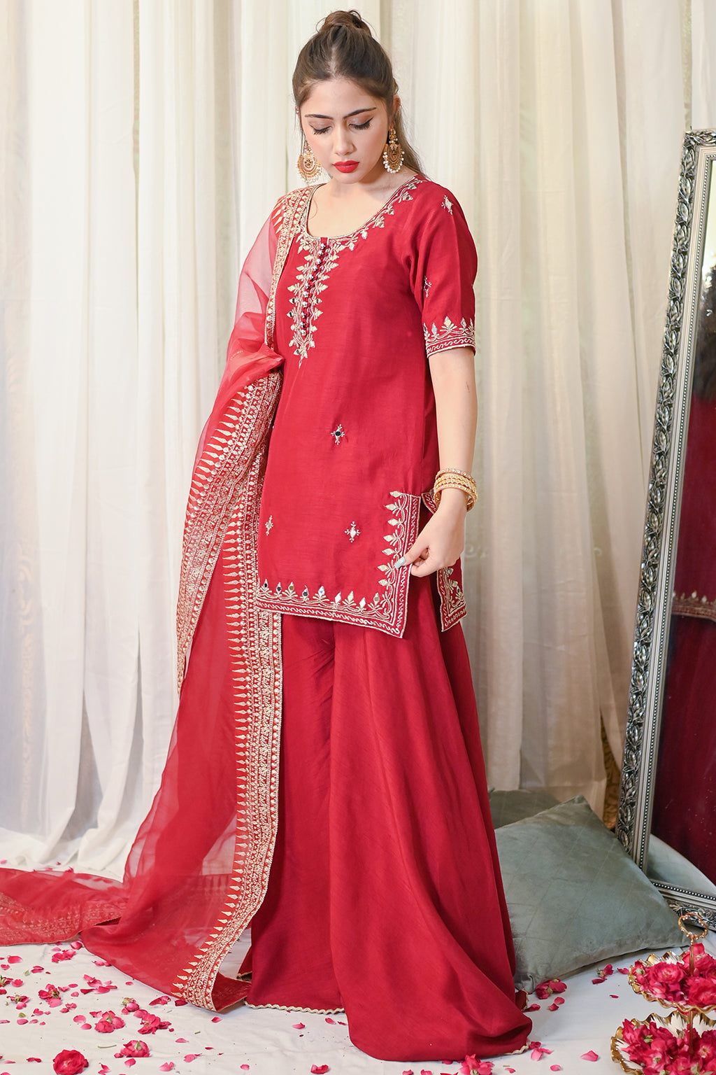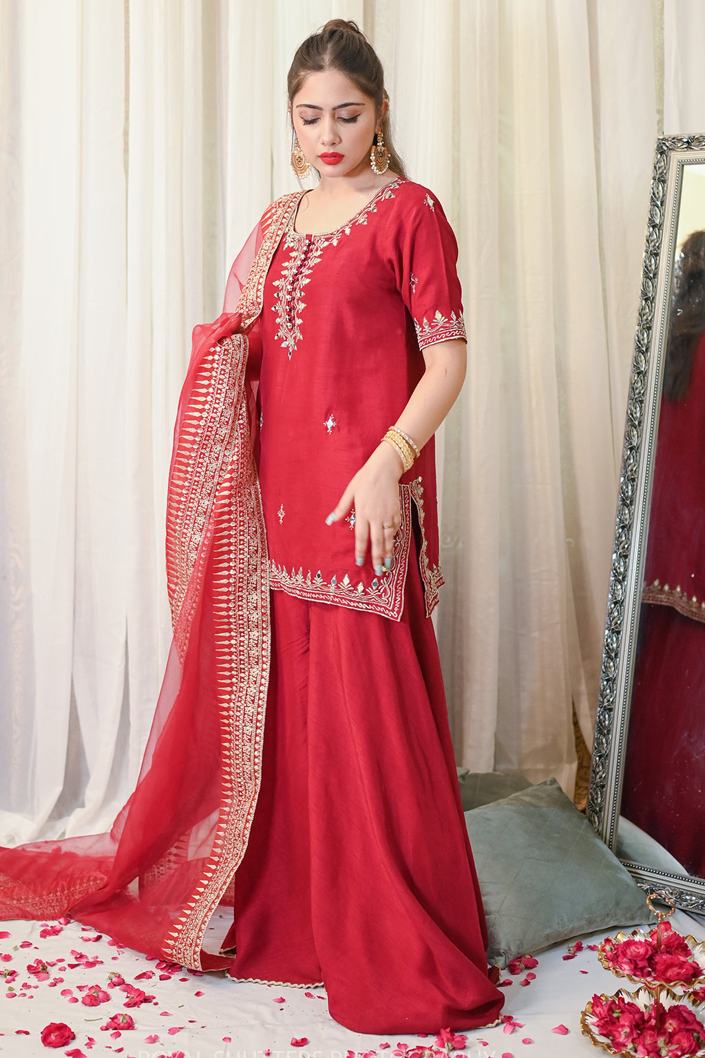 Korean Rawsilk Dupatta: Soft Matte Organza Details: Tilla and Mirror work