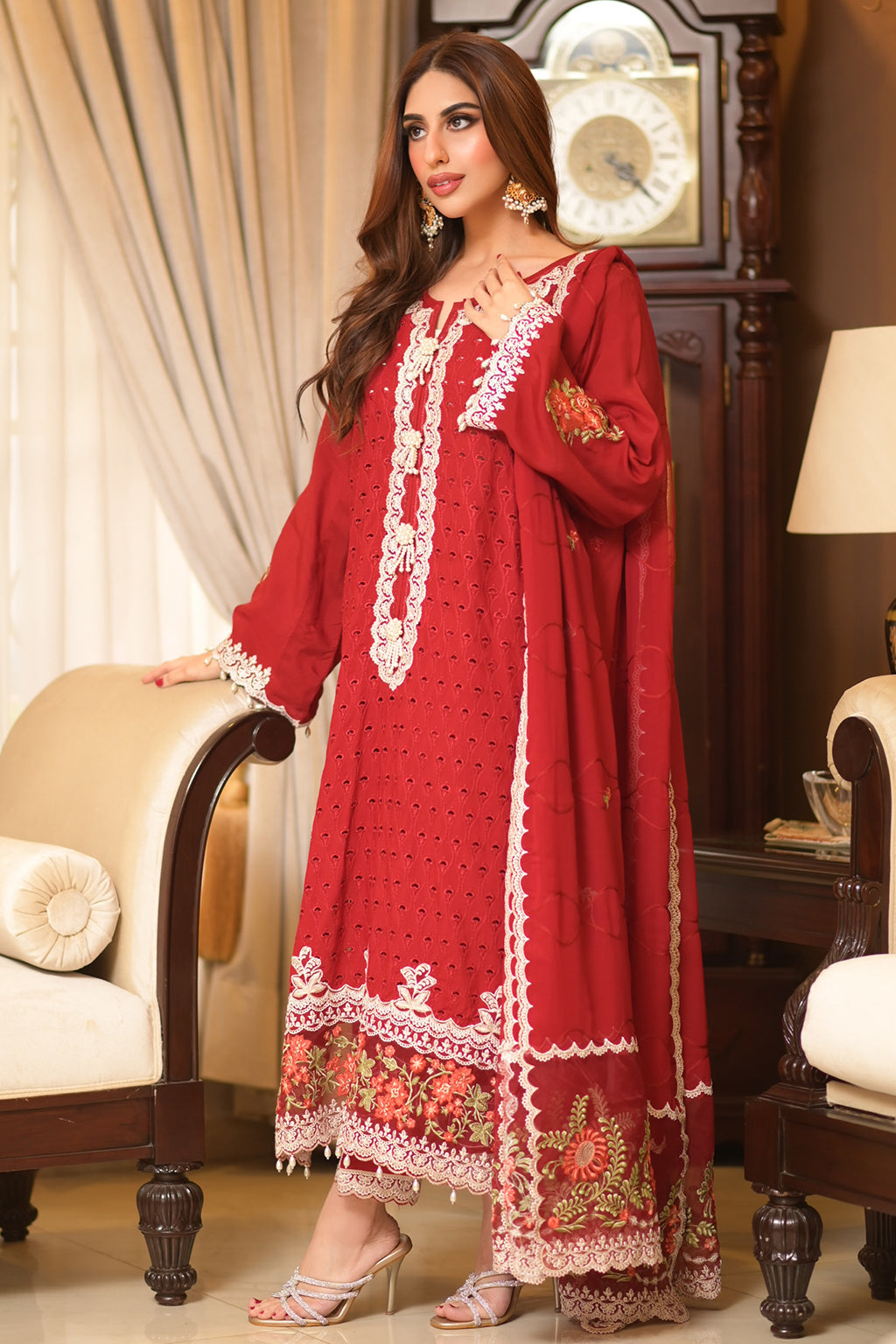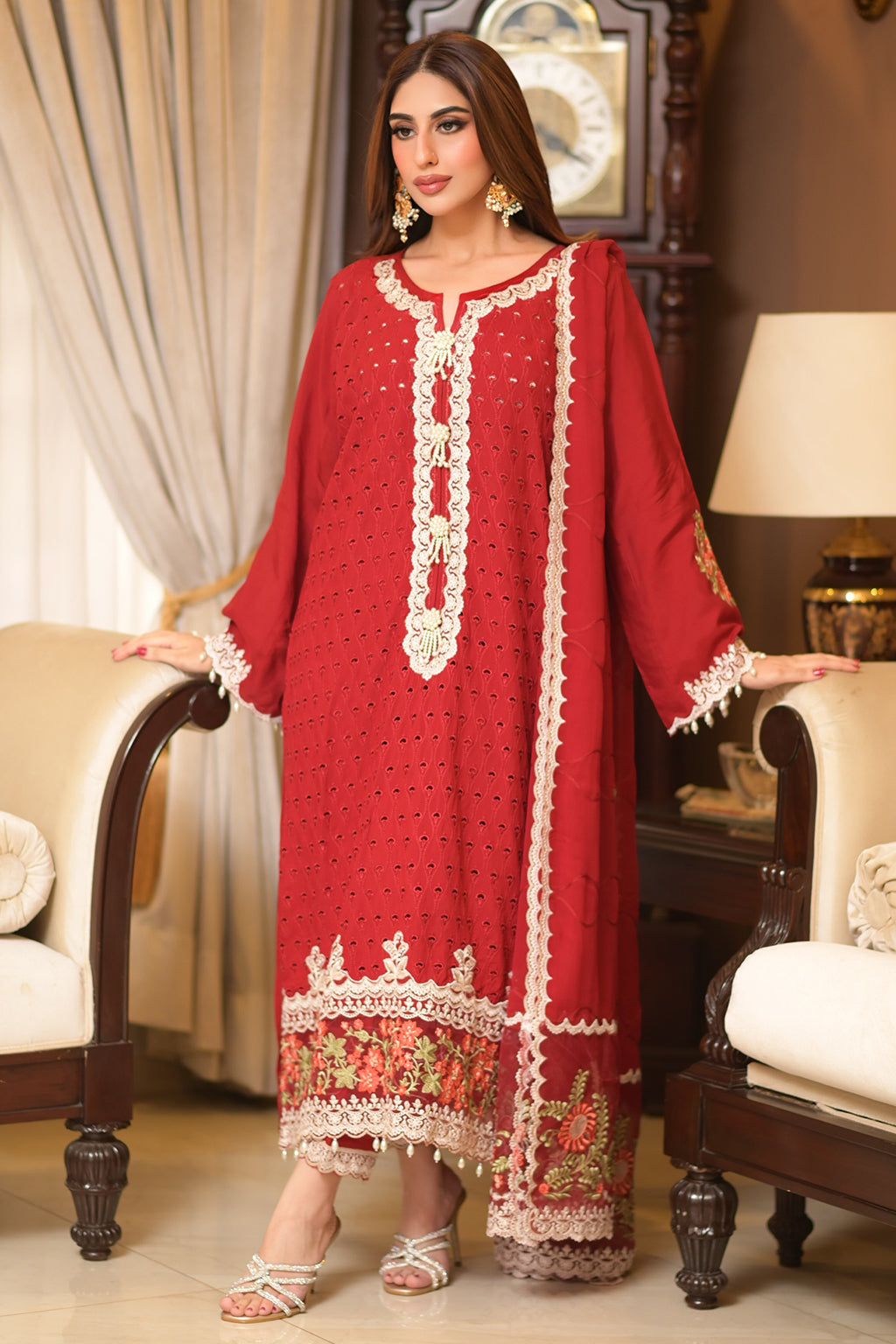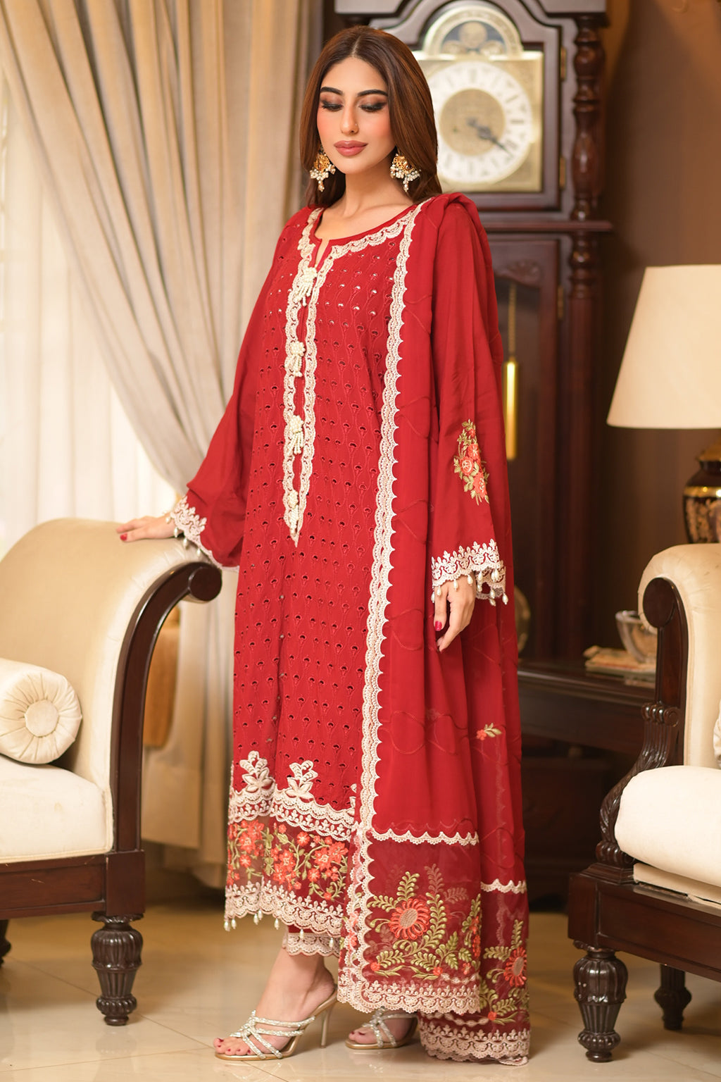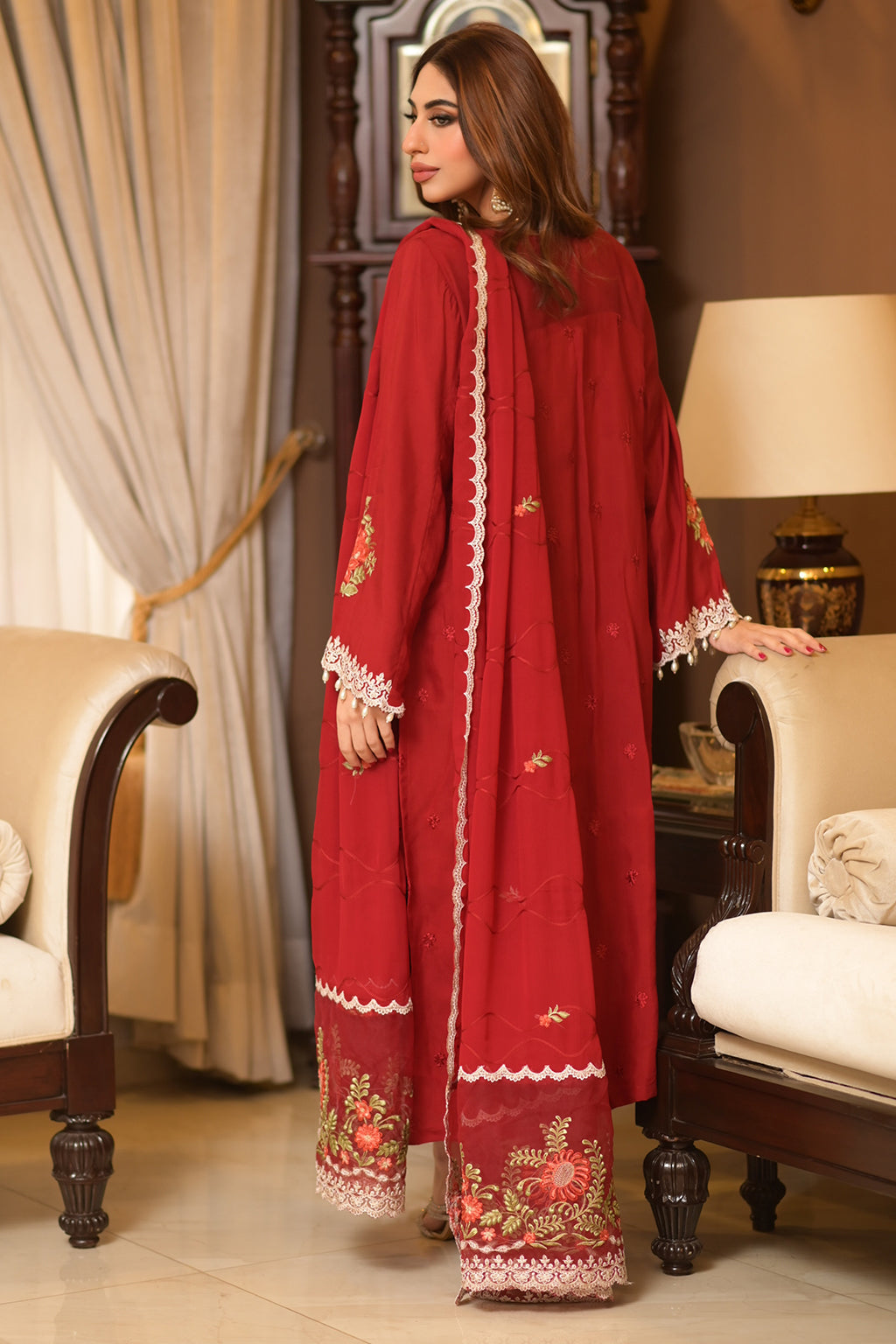 | Full Embroidered front Embroidered back Embroidered sleeves Embroidered organza daman patch Embroidered organza neckline patch Embroidered chiffon dupatta Embroidered dupatta pallu patches Viscose Lawn Pants |