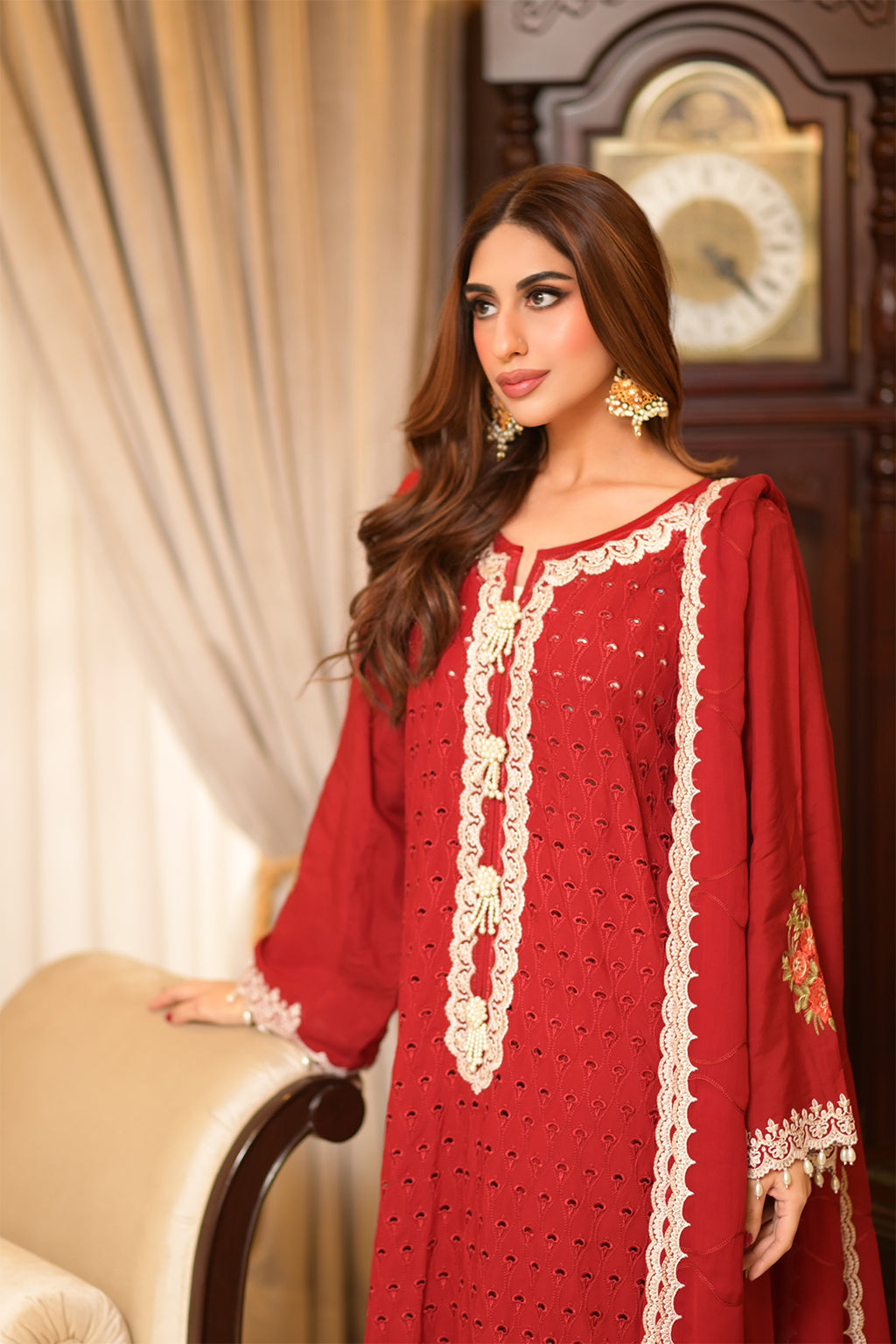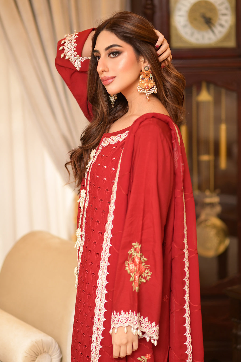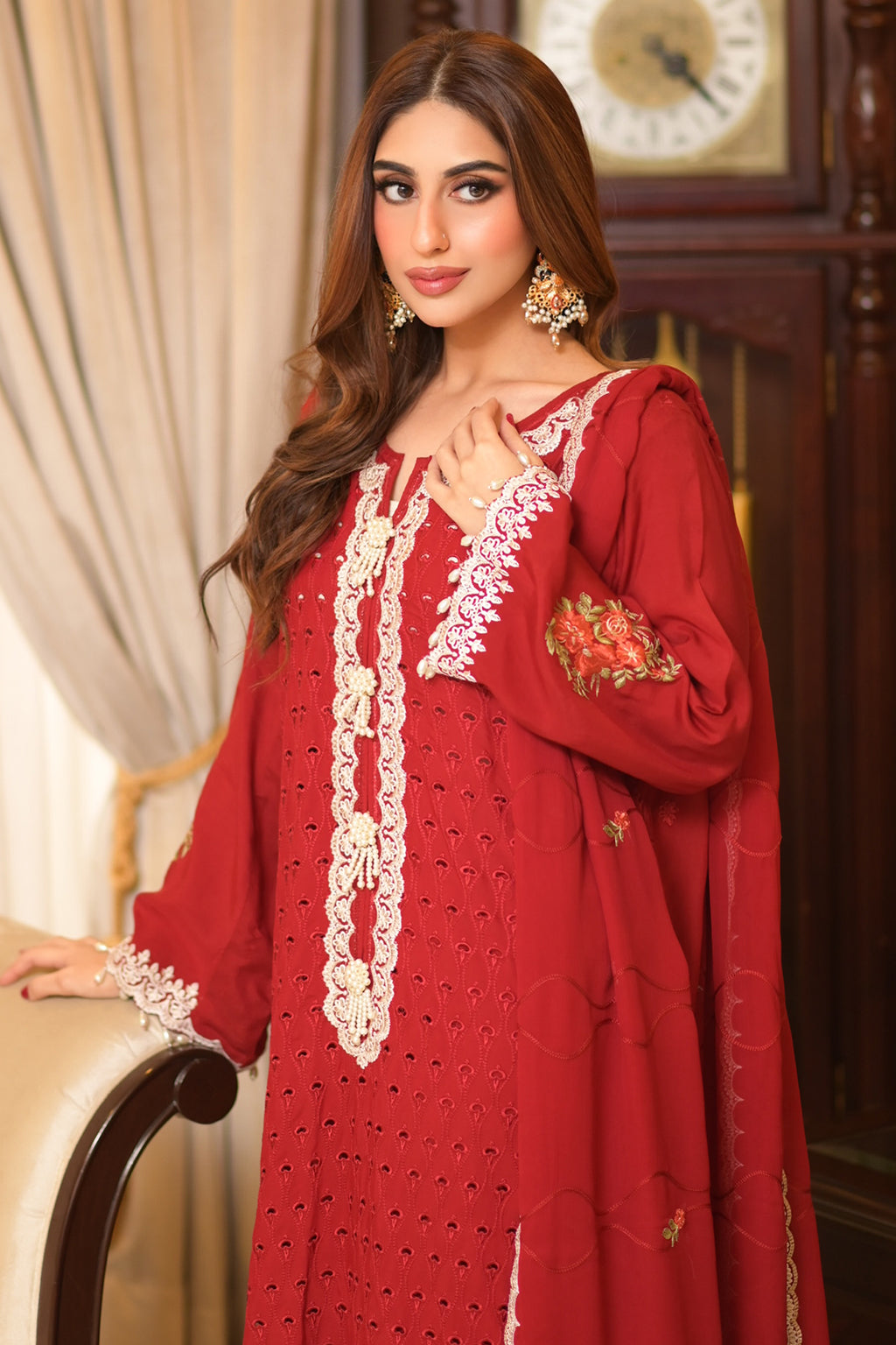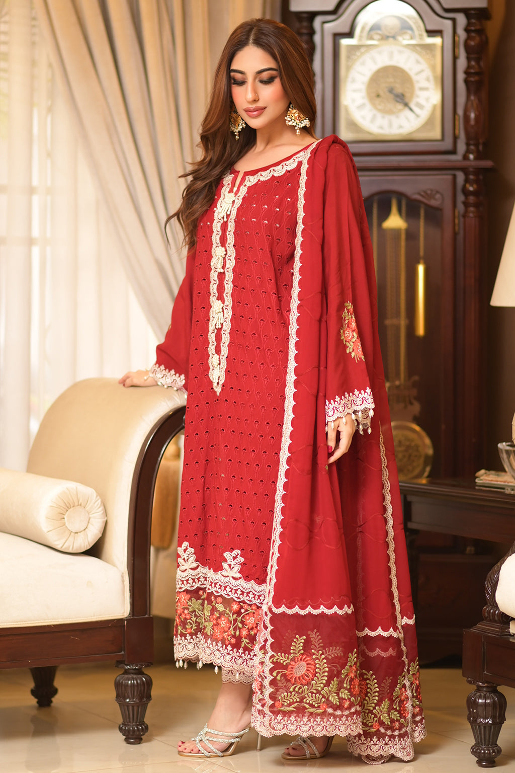 | Full Embroidered front Embroidered back Embroidered sleeves Embroidered organza daman patch Embroidered organza neckline patch Embroidered chiffon dupatta Embroidered dupatta pallu patches Viscose Lawn Pants |