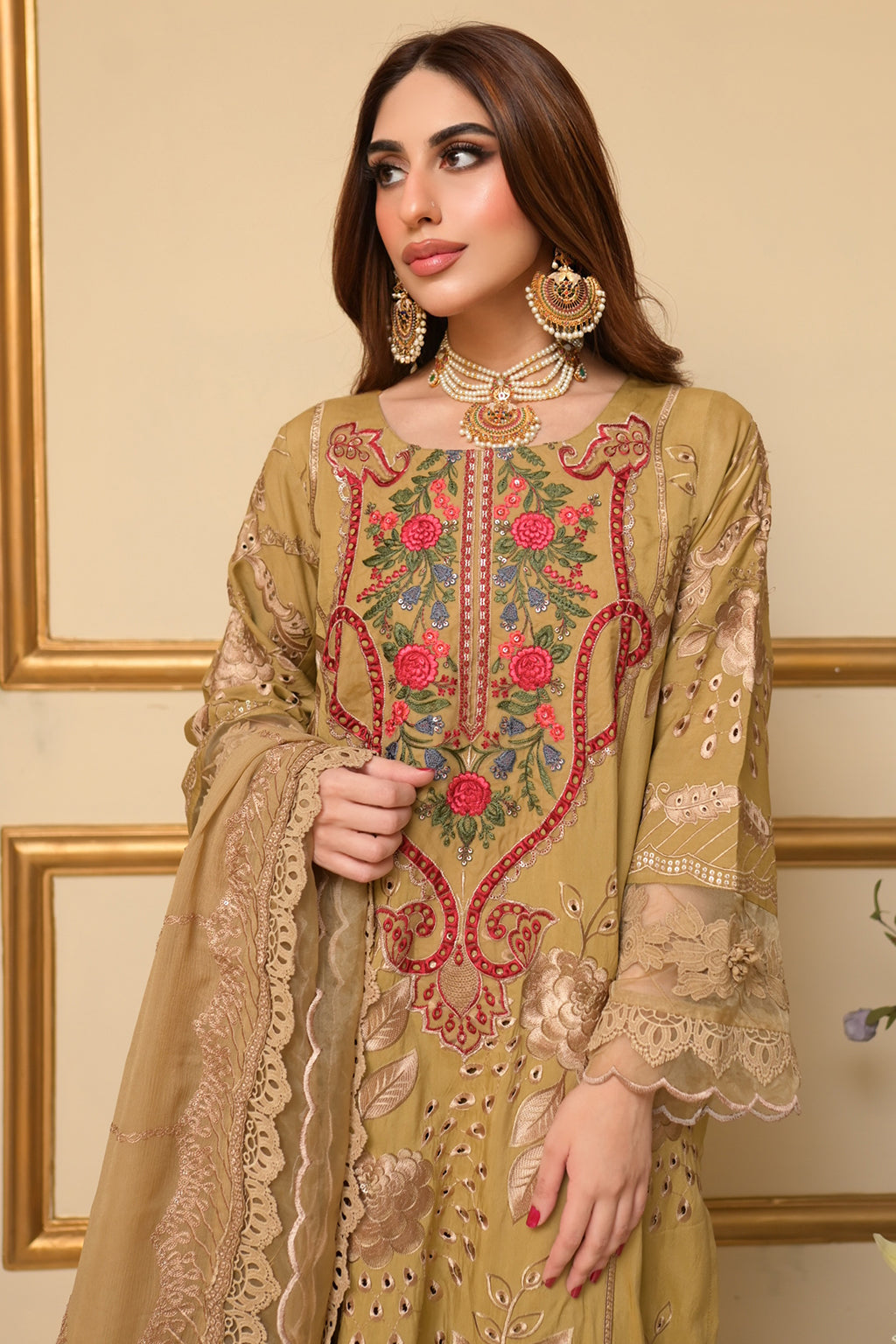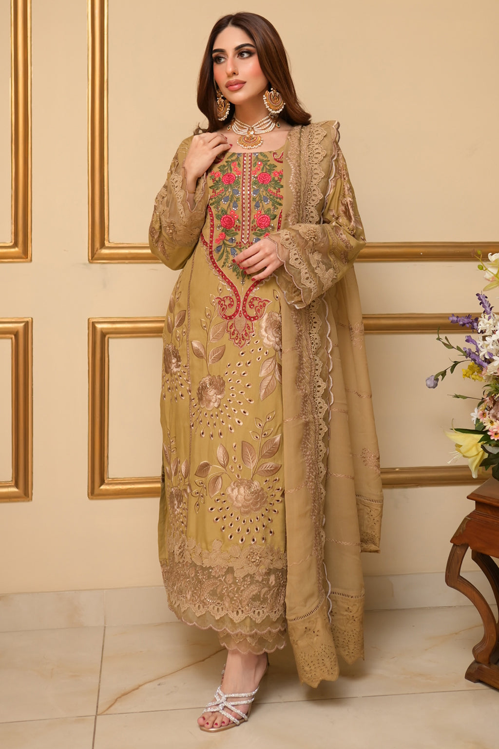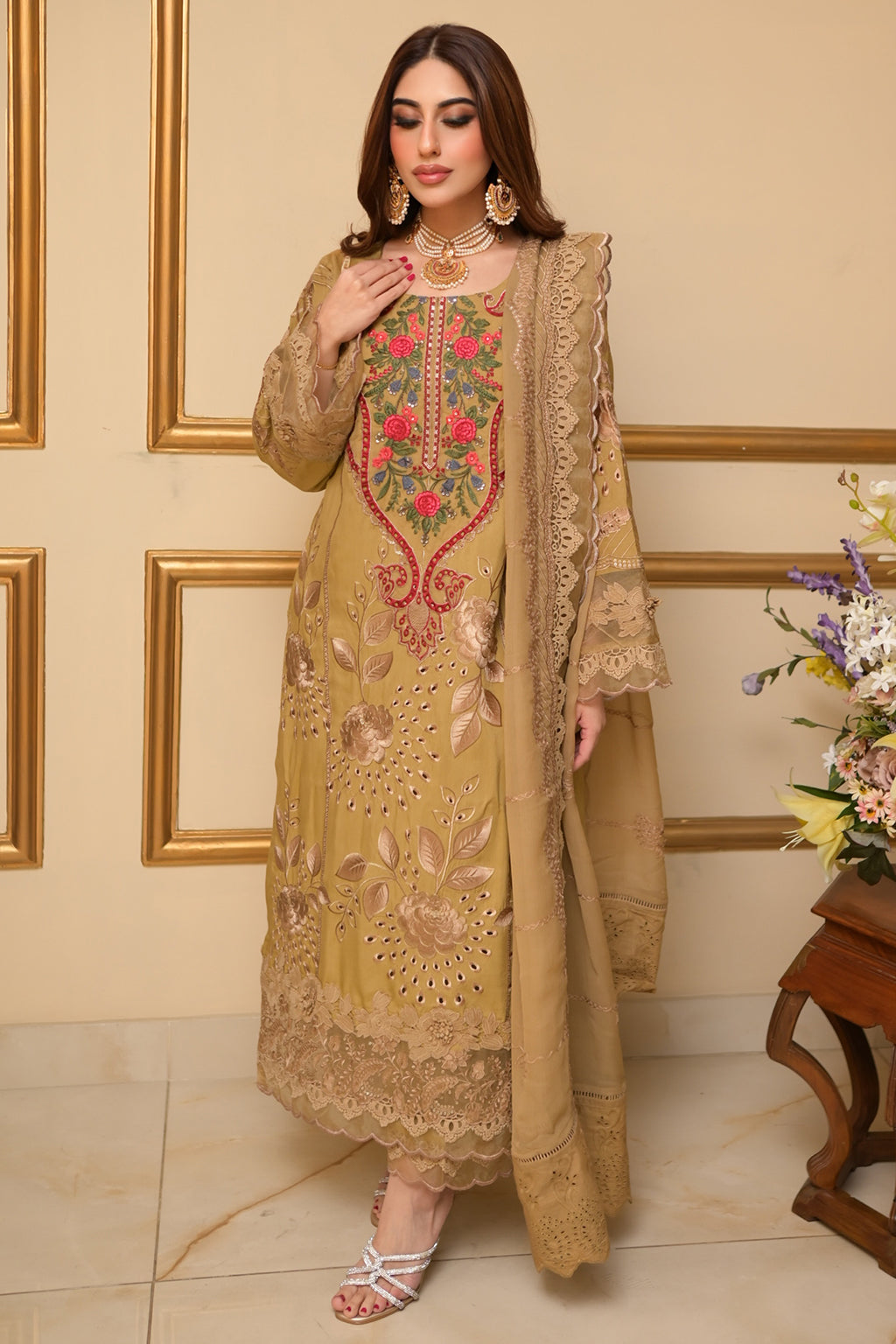 | Full Embroidered front Embroidered back Embroidered sleeves Embroidered chiffon dupatta Embroidered organza neckline patch Embroidered organza daman patch Viscose Lawn Pants |
