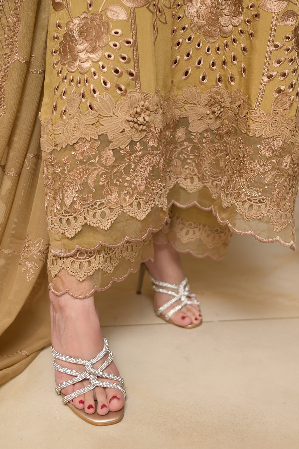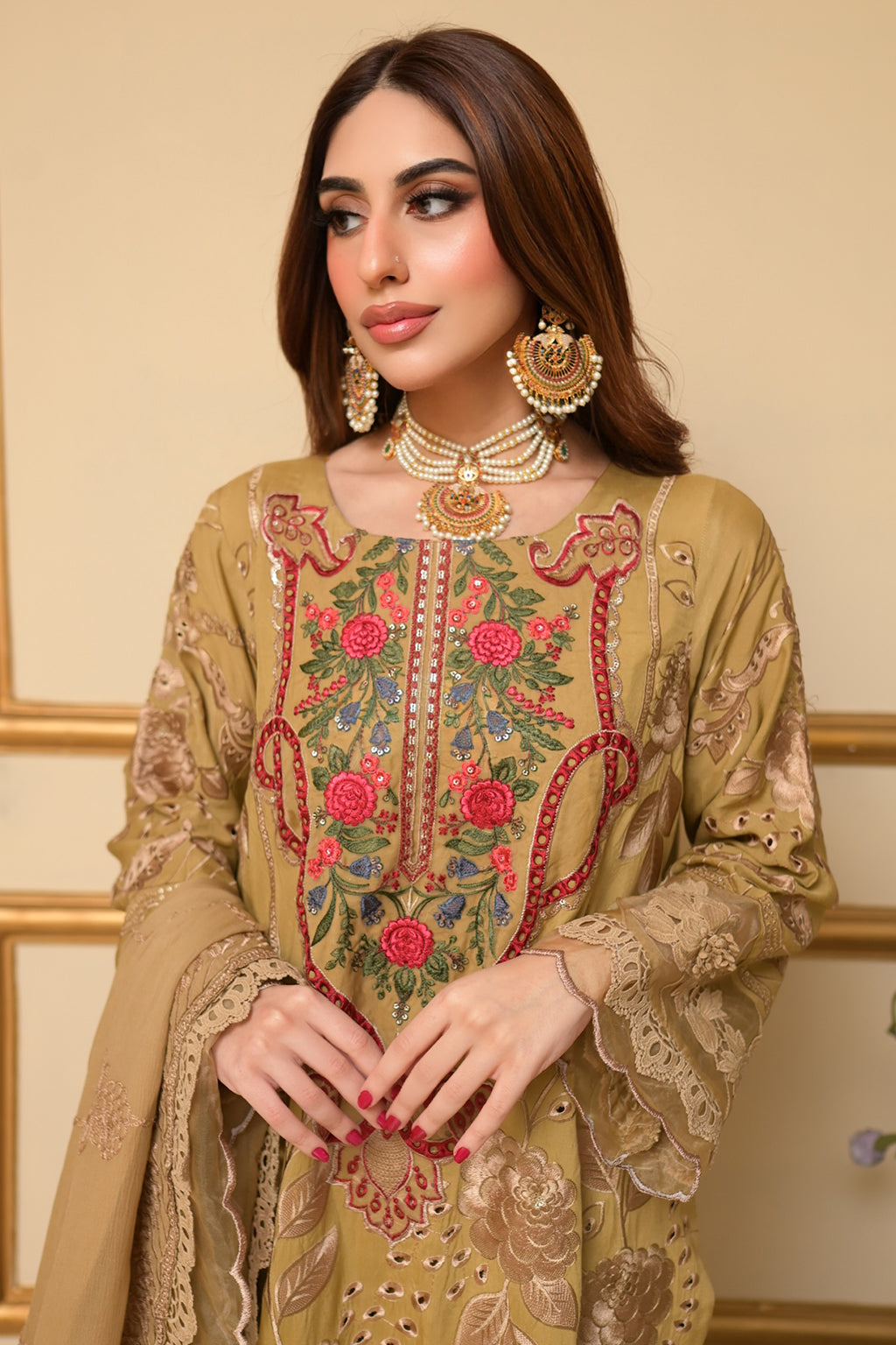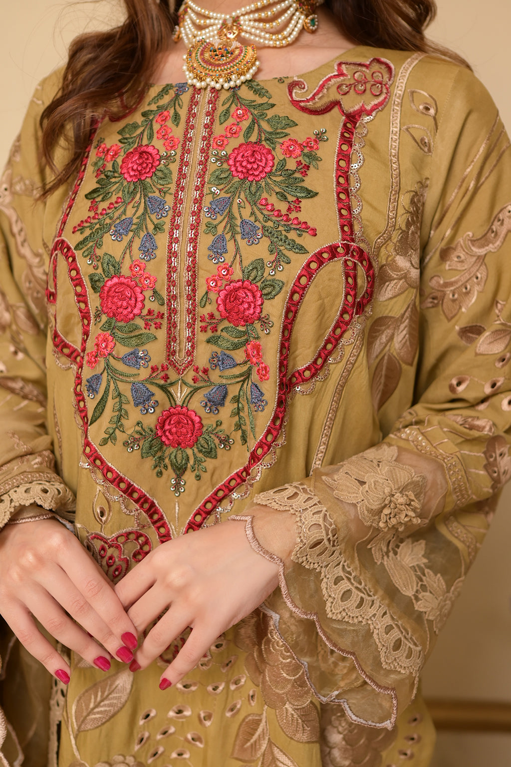 | Full Embroidered front Embroidered back Embroidered sleeves Embroidered chiffon dupatta Embroidered organza neckline patch Embroidered organza daman patch Viscose Lawn Pants |
