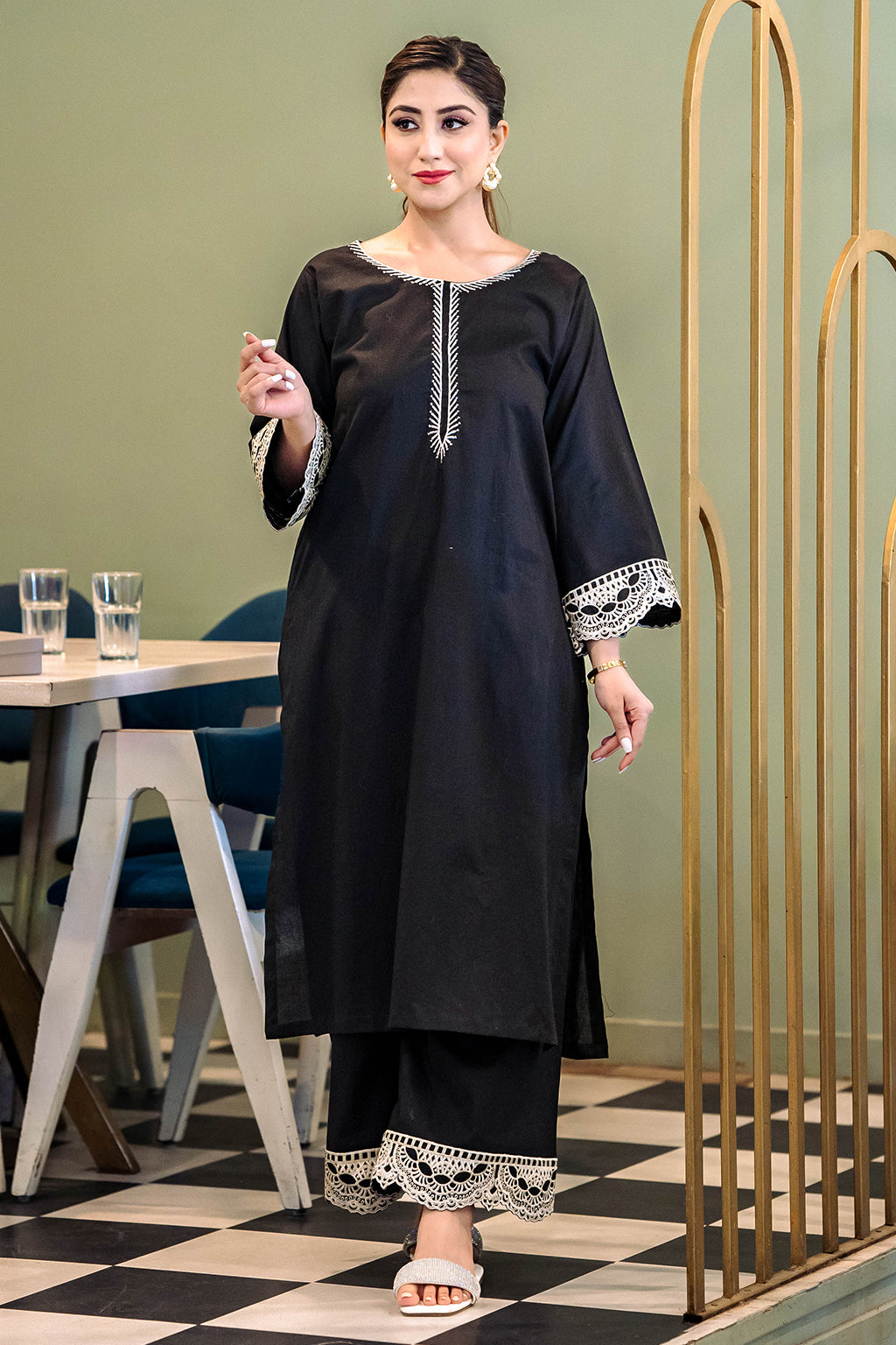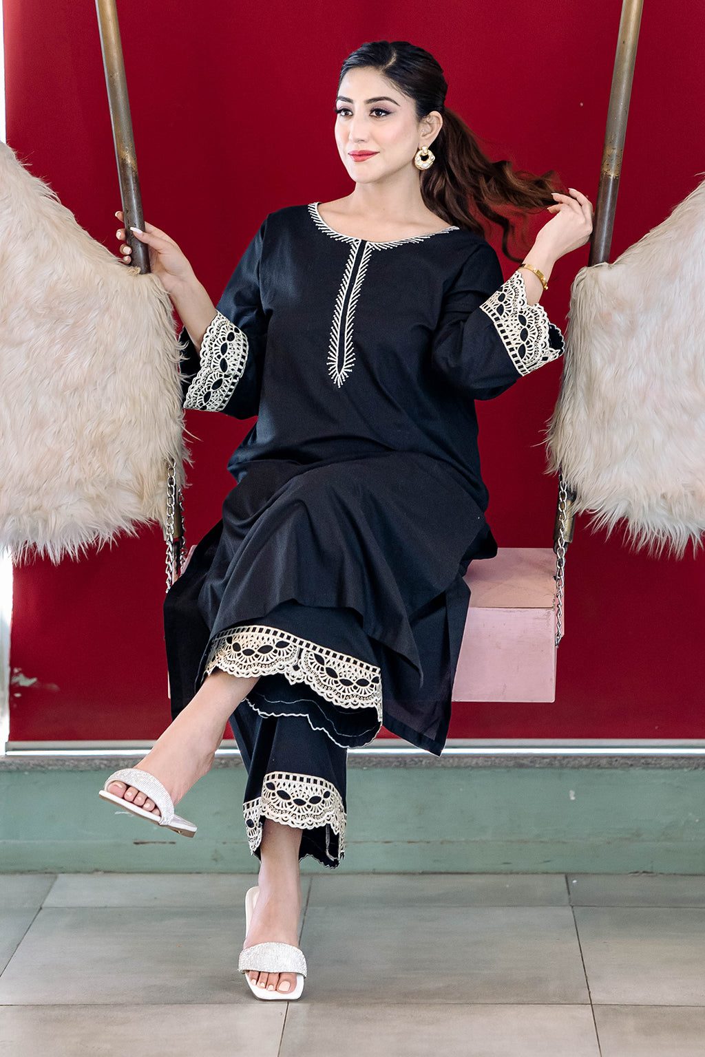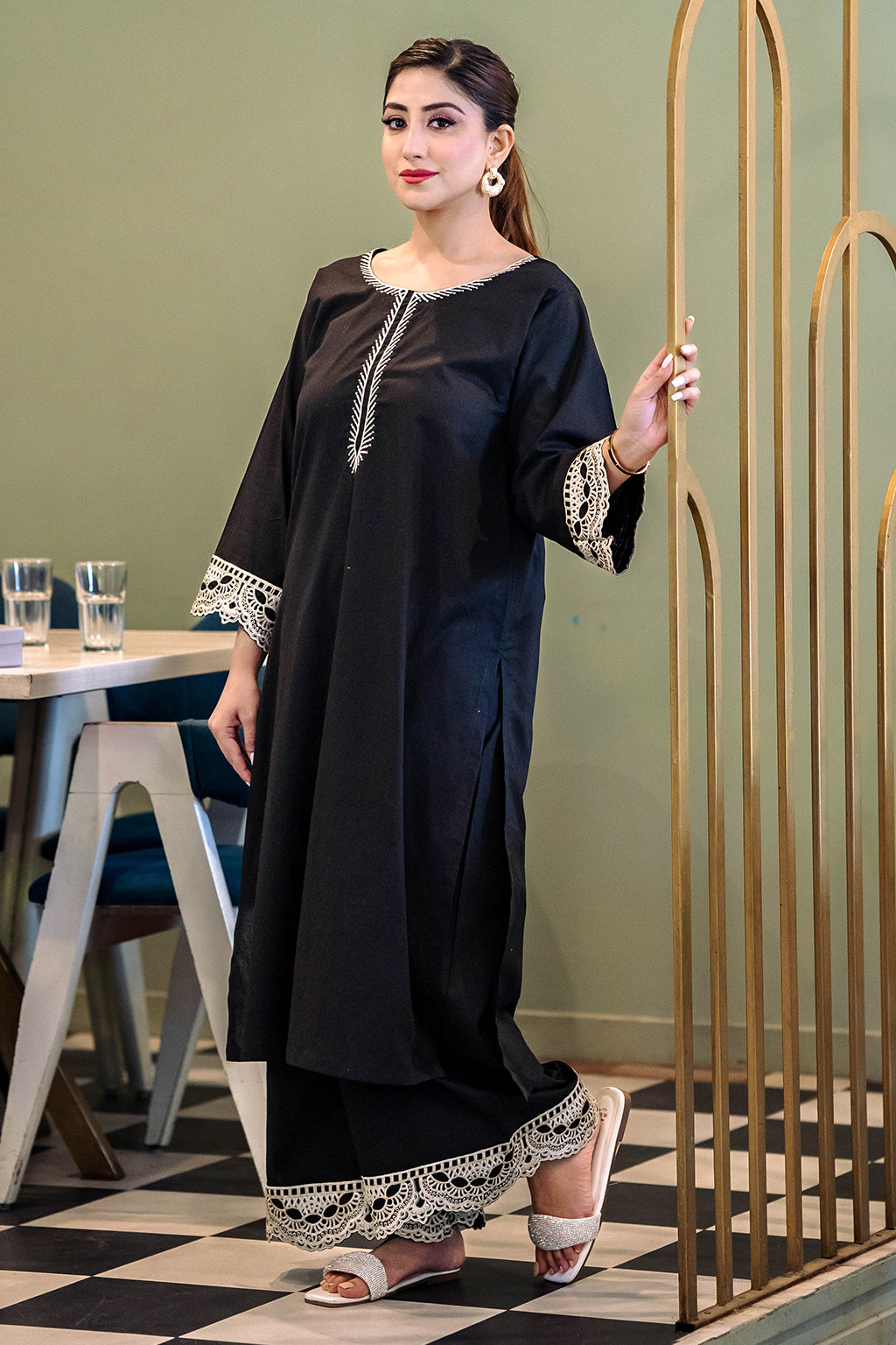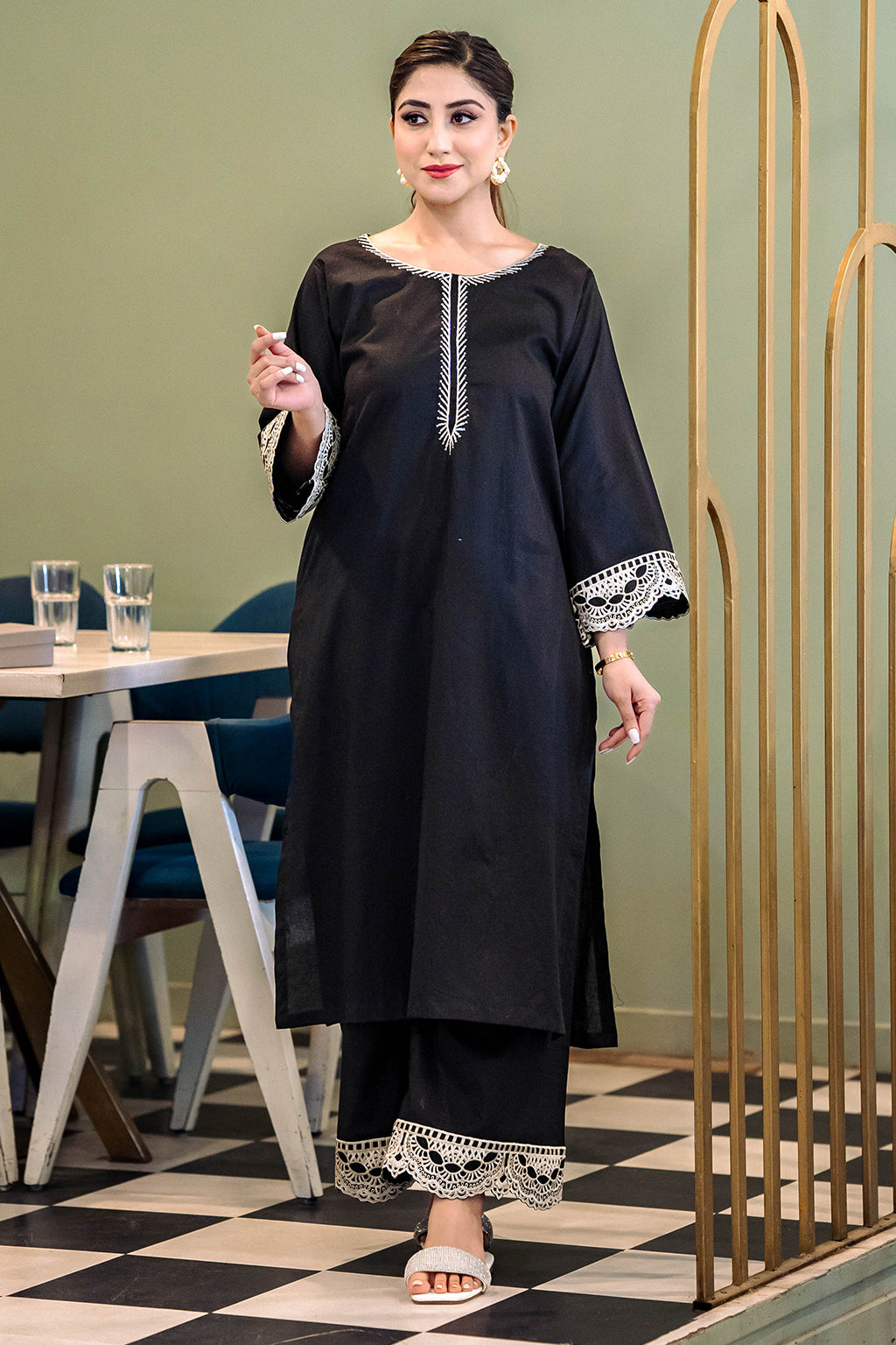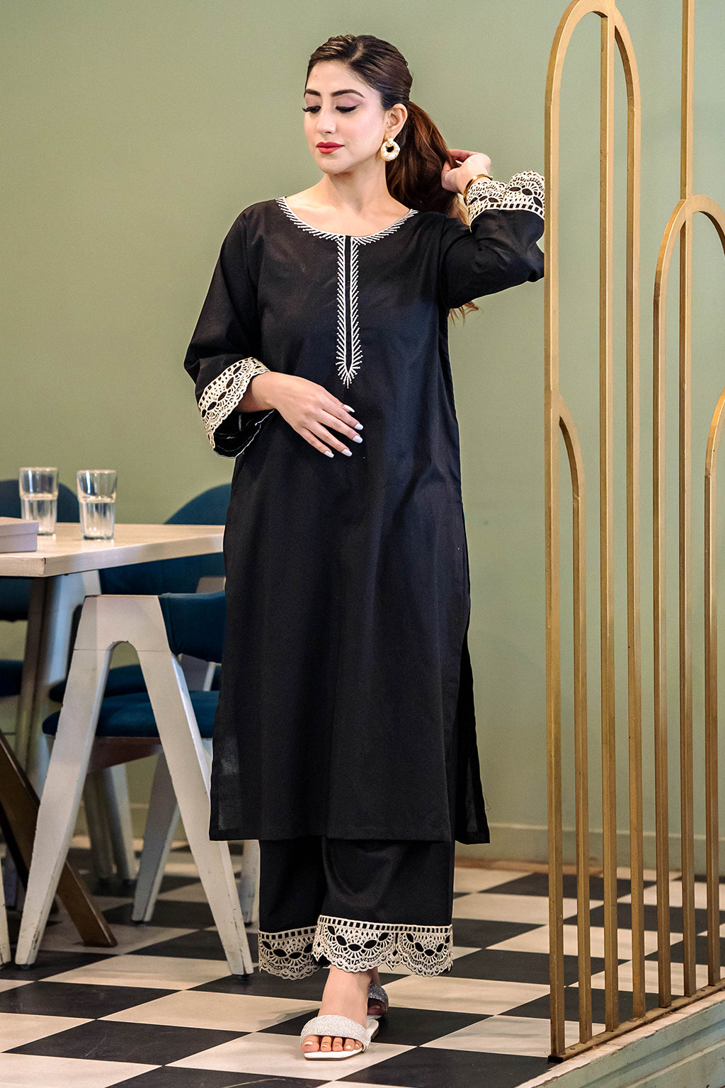 Lawn monochrome co-ord set with embroidered neckline and embroidered lace