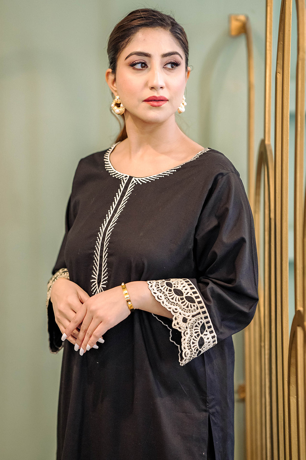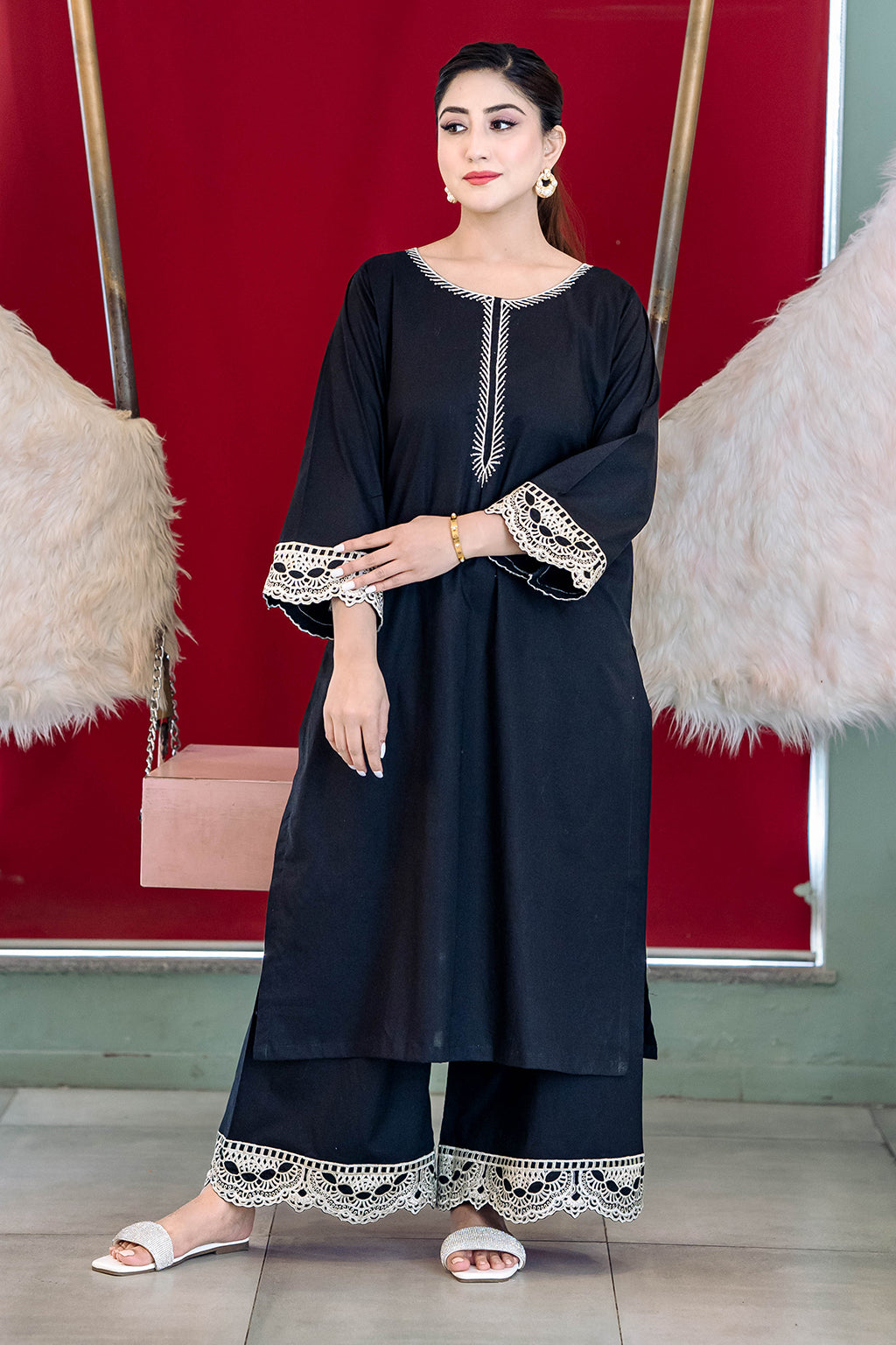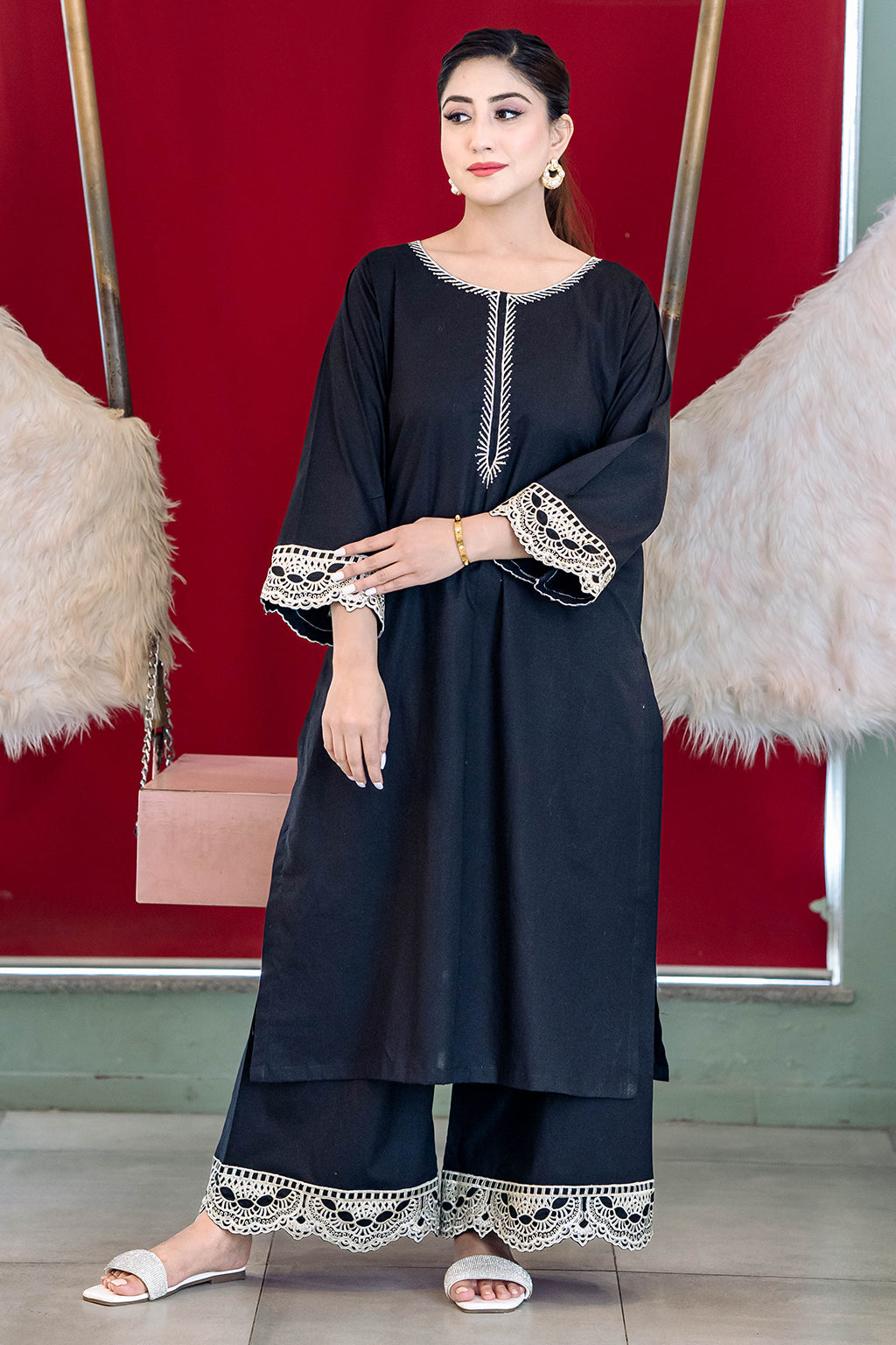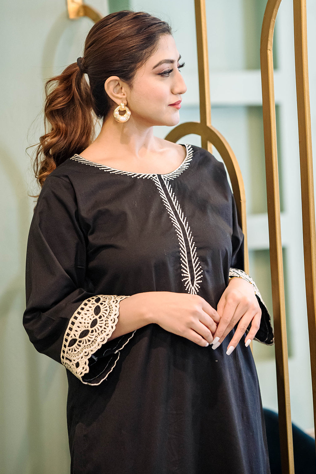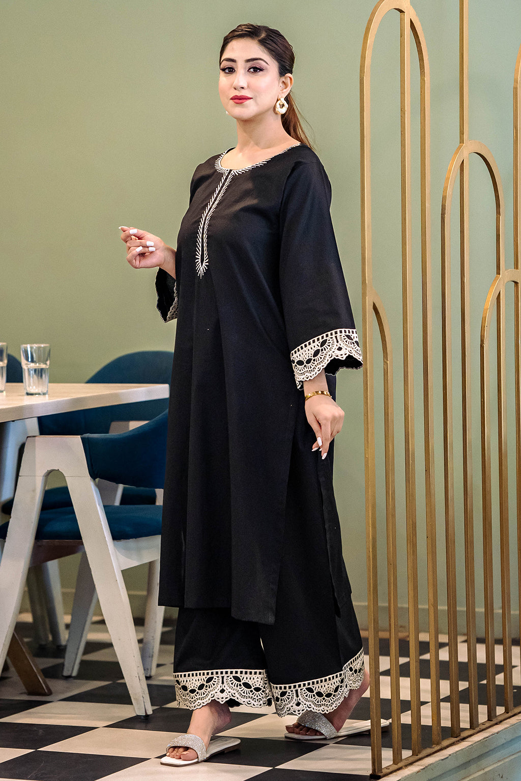 Lawn monochrome co-ord set with embroidered neckline and embroidered lace