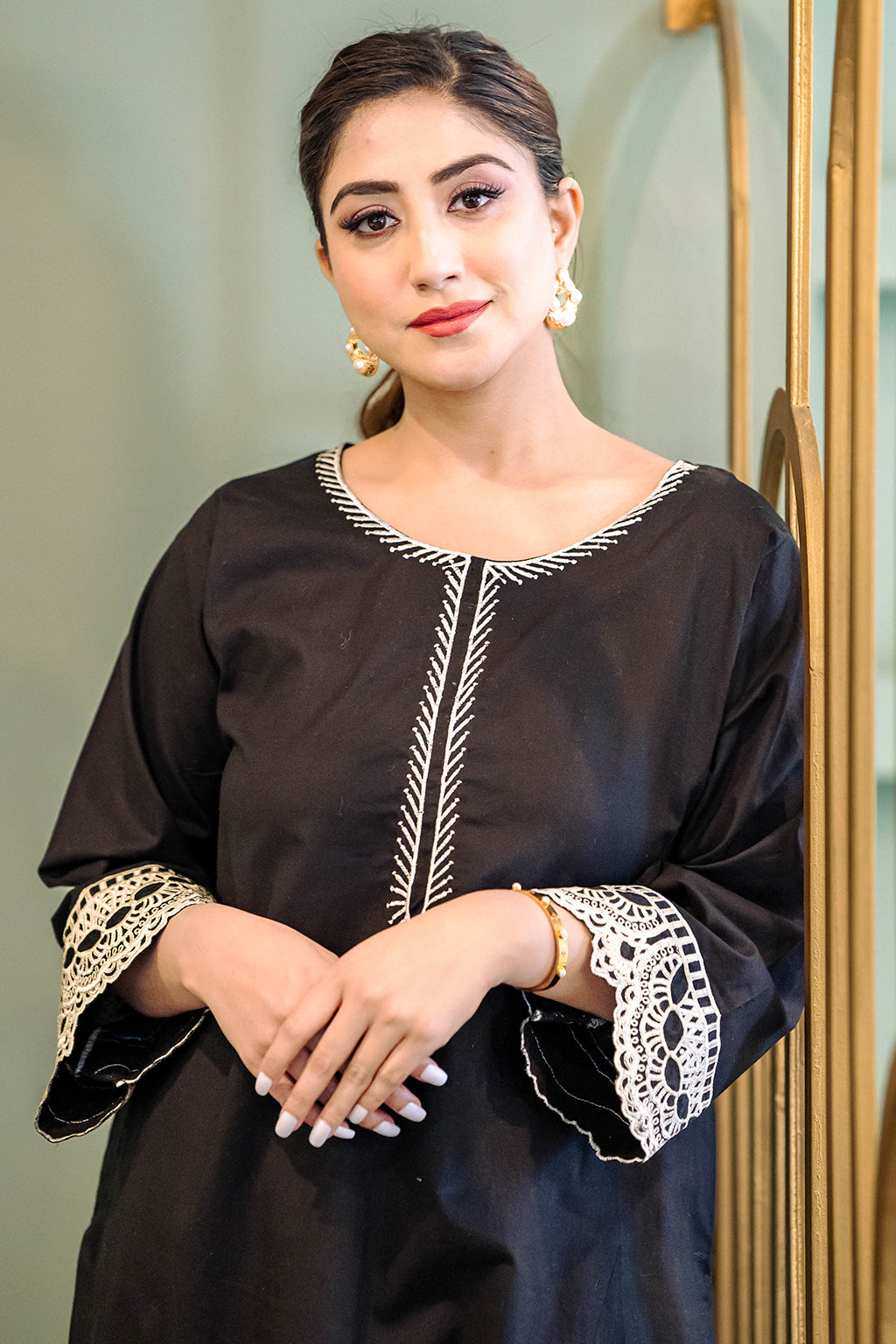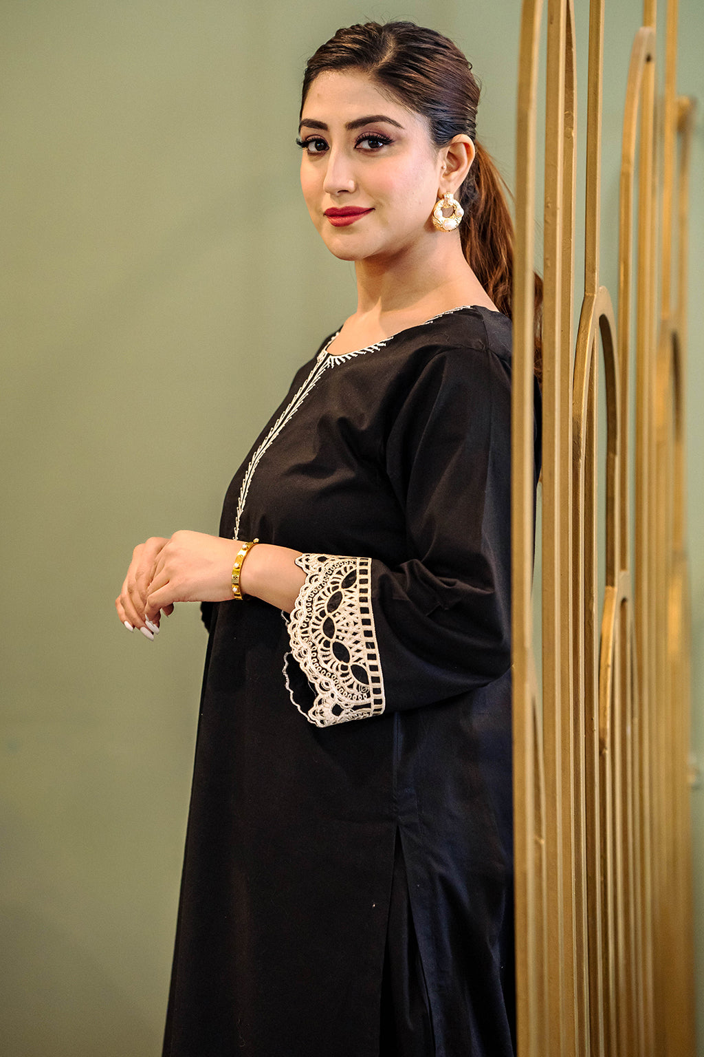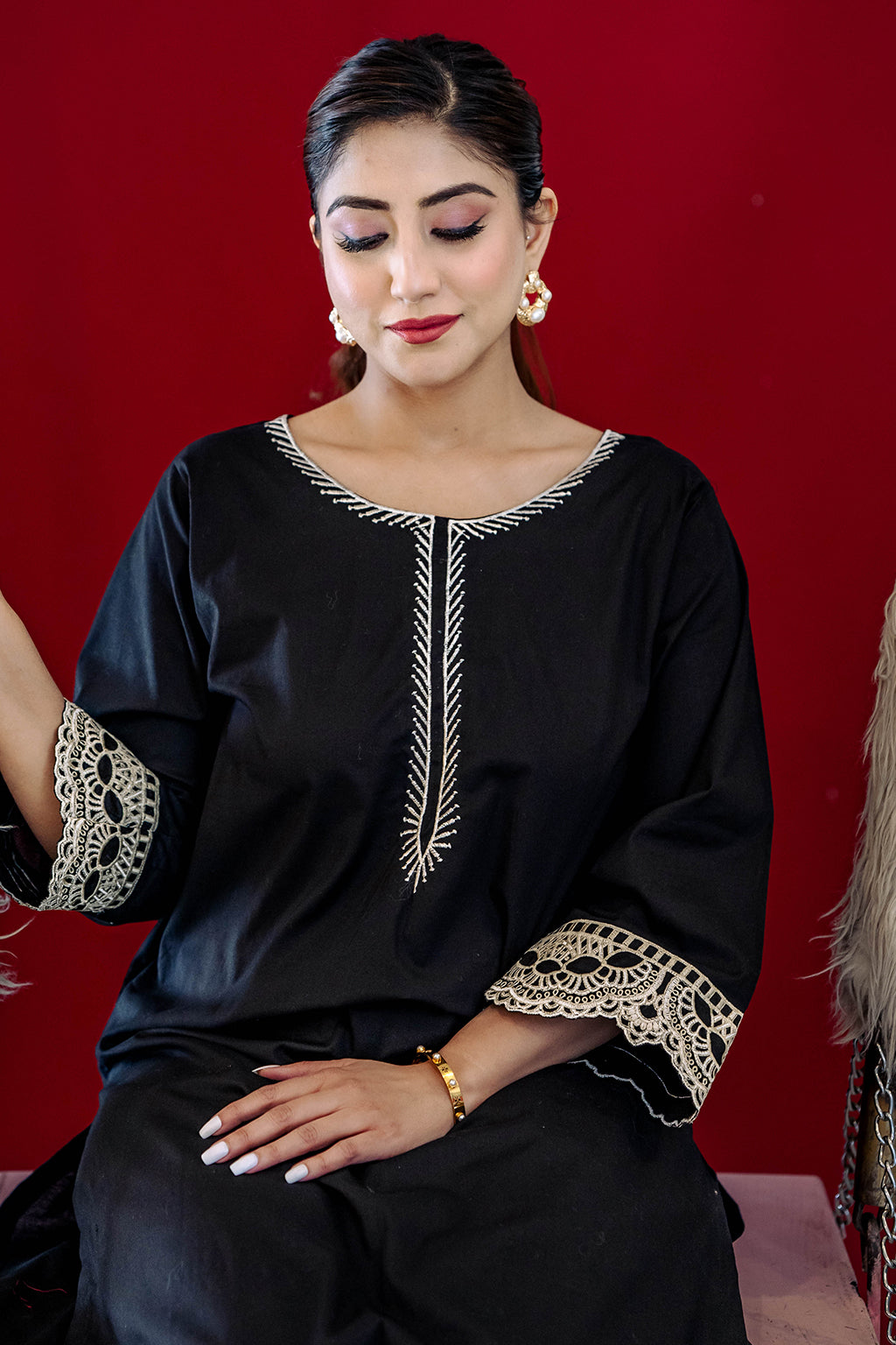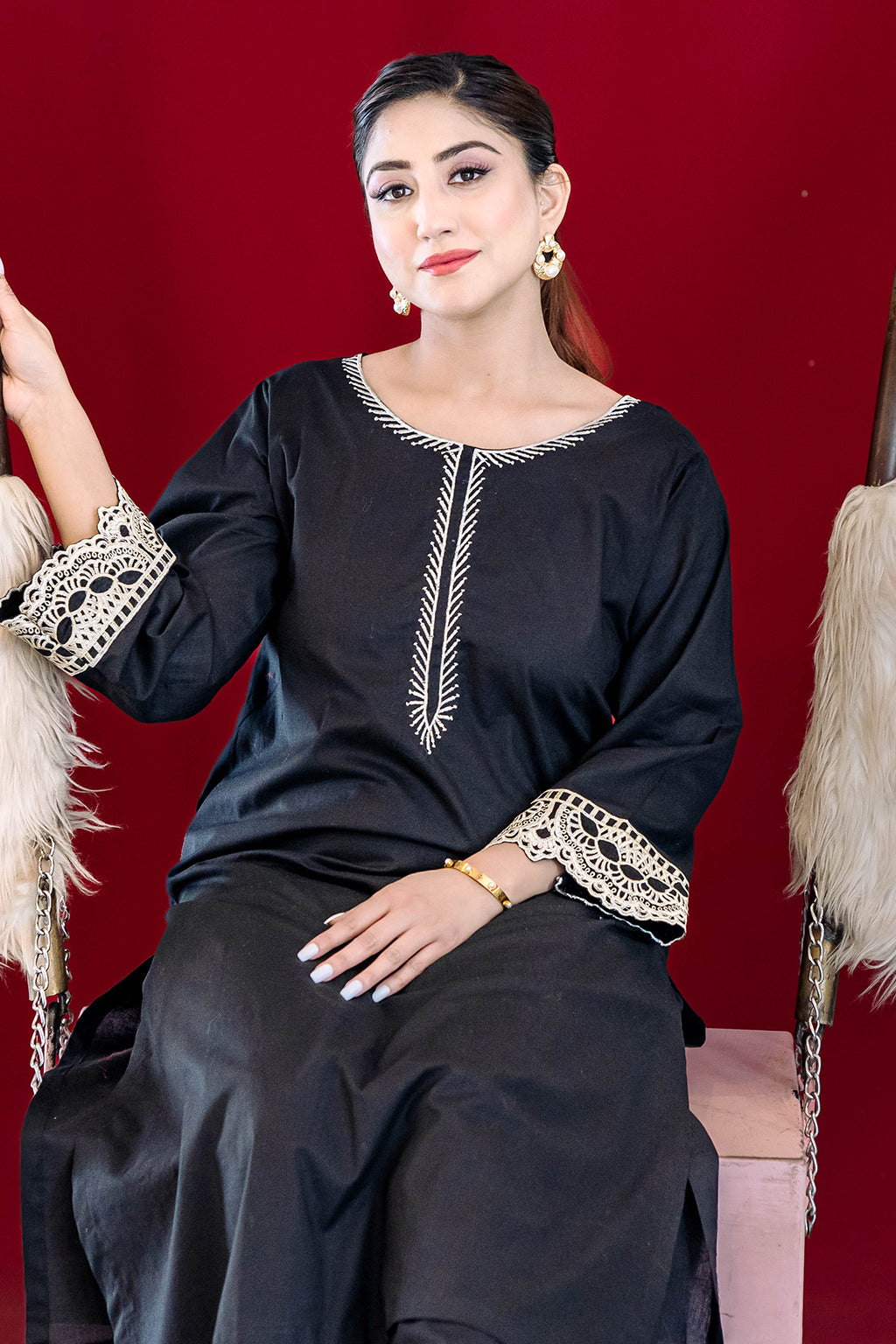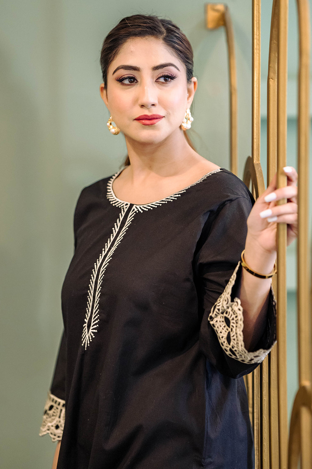 Lawn monochrome co-ord set with embroidered neckline and embroidered lace
