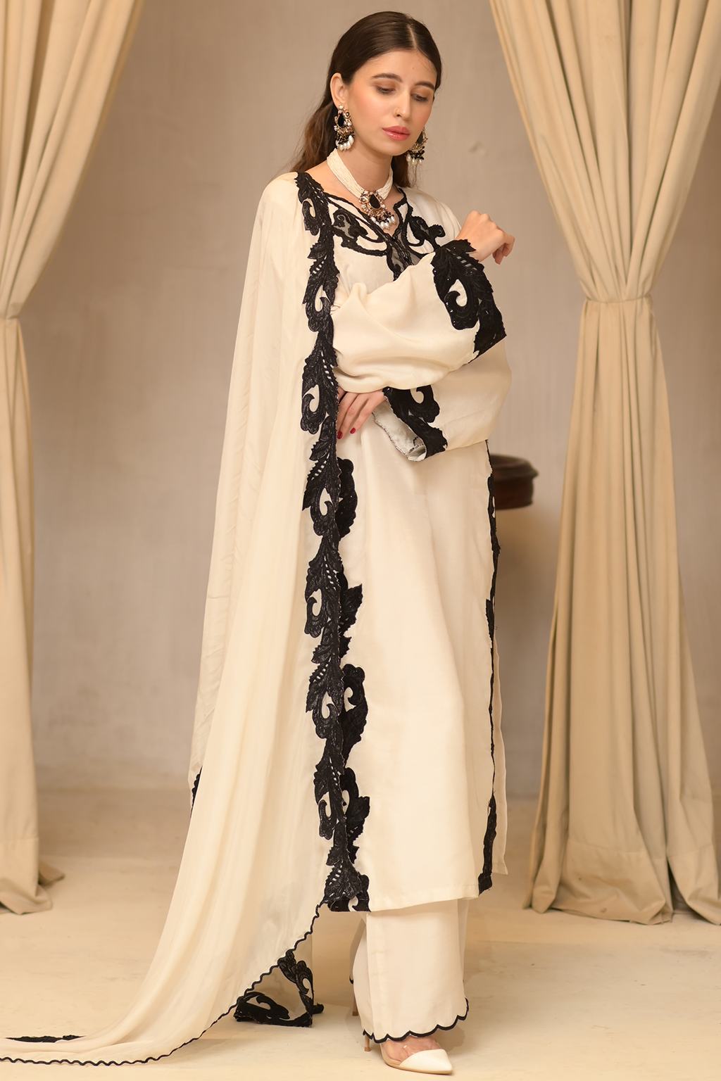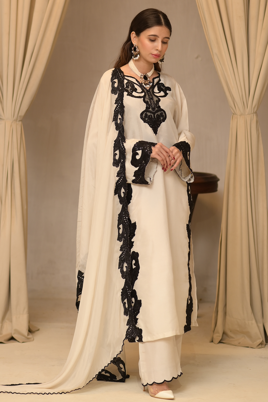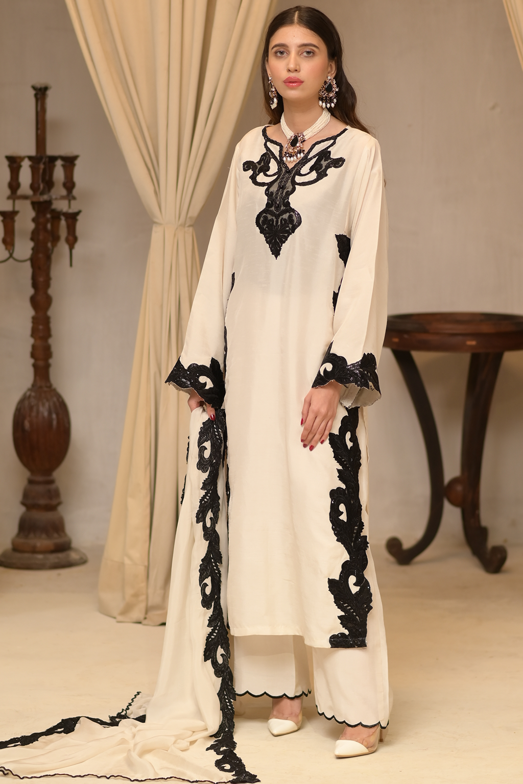 Korean rawsilk shirt and pants with silk dupatta. Thread embroidery with sequins work.