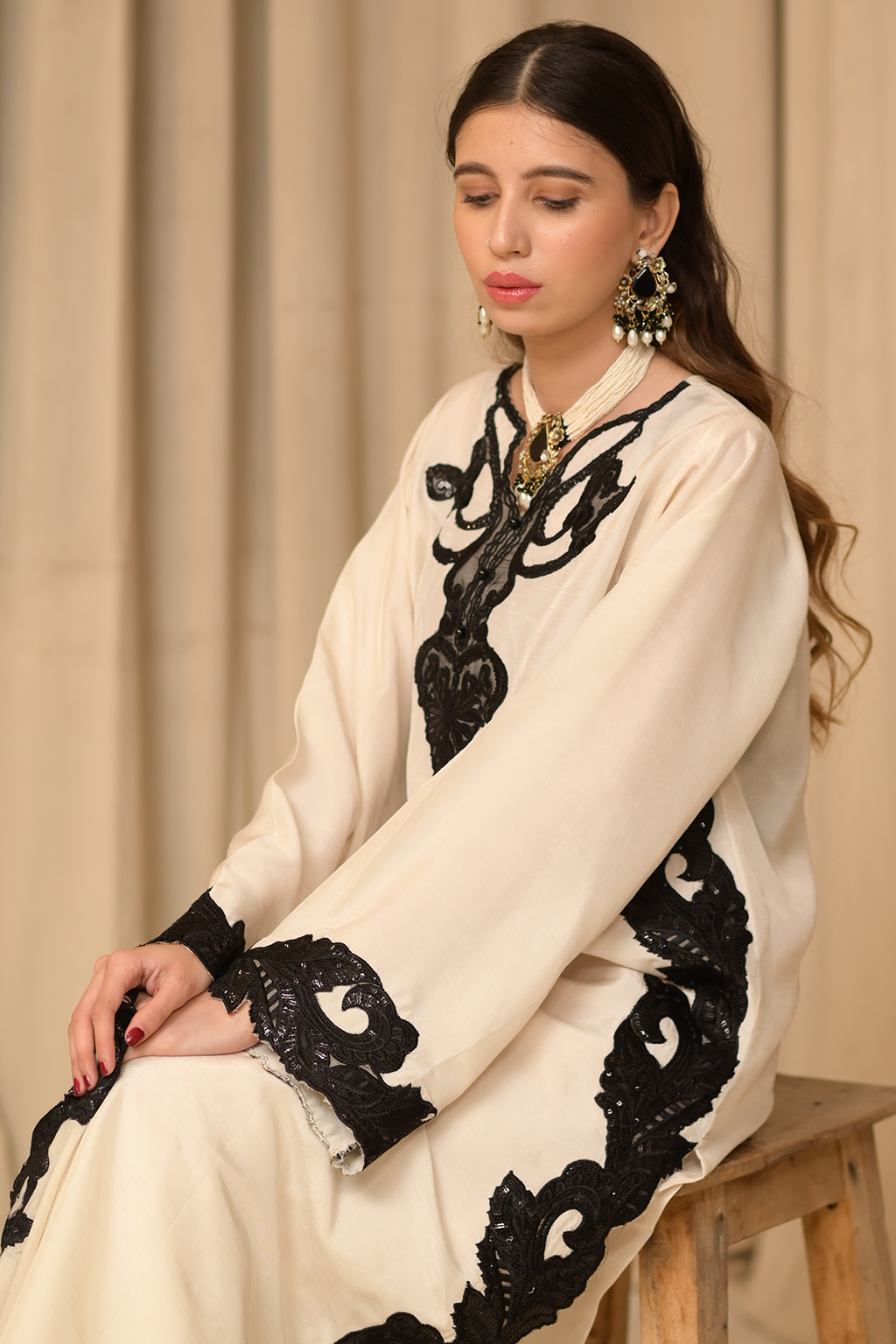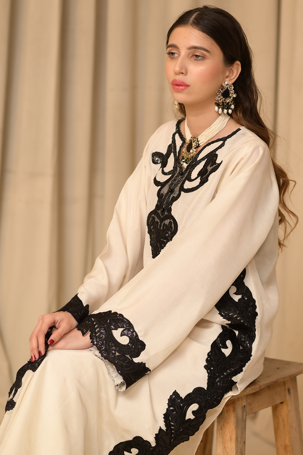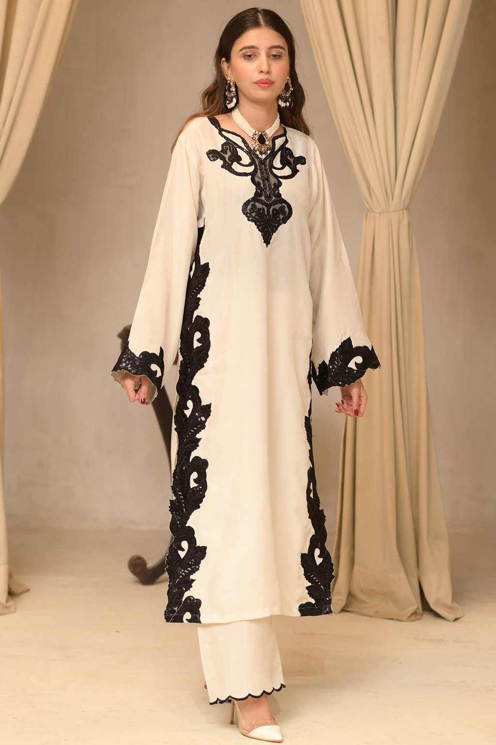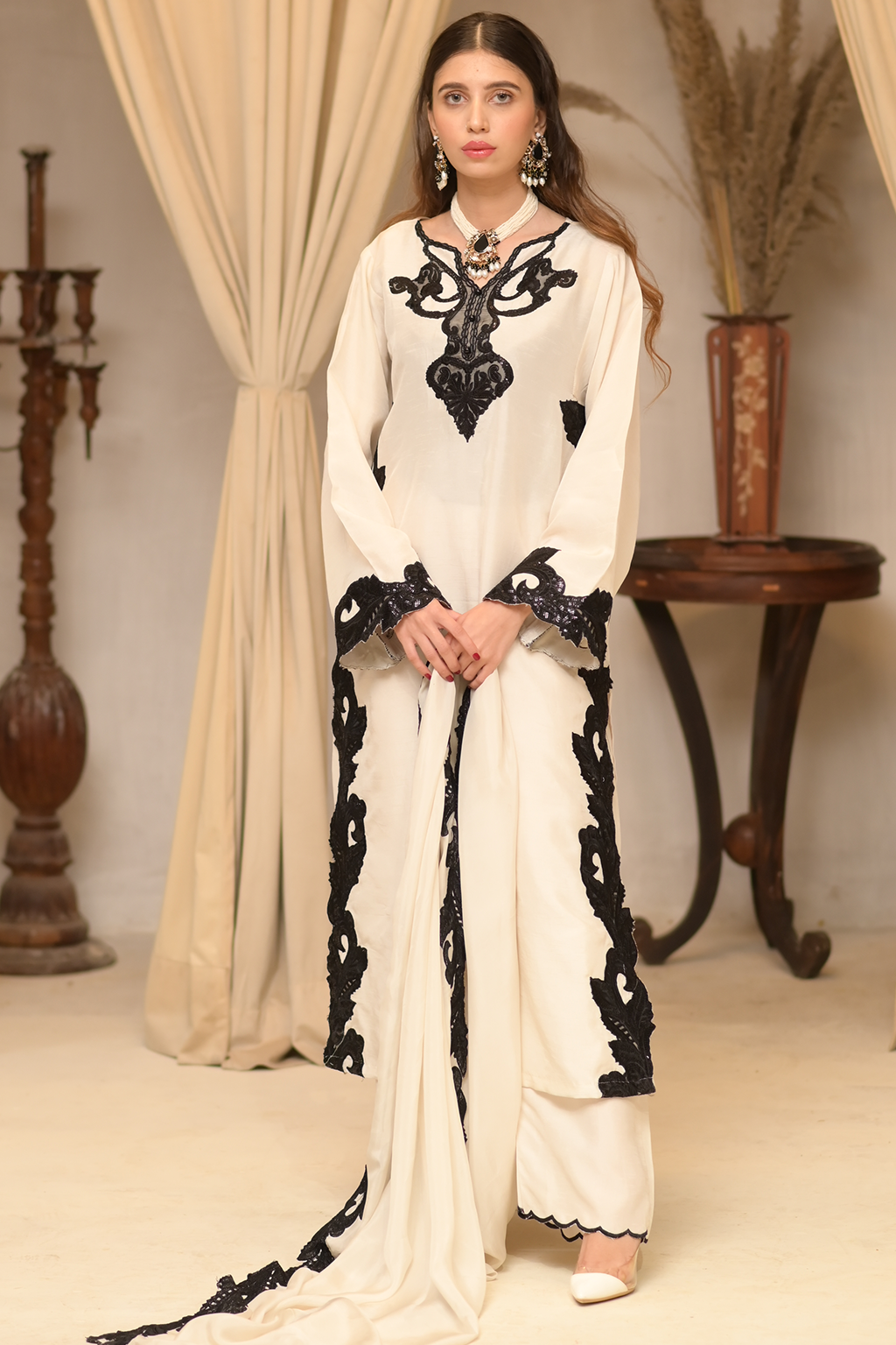 Korean rawsilk shirt and pants with silk dupatta. Thread embroidery with sequins work.