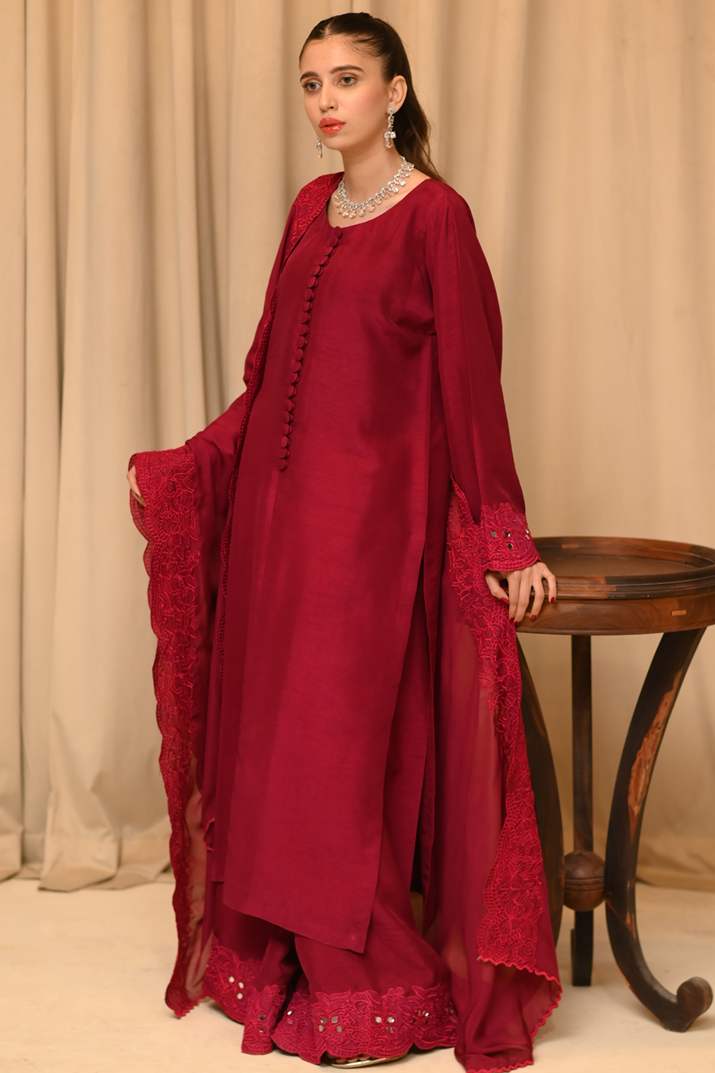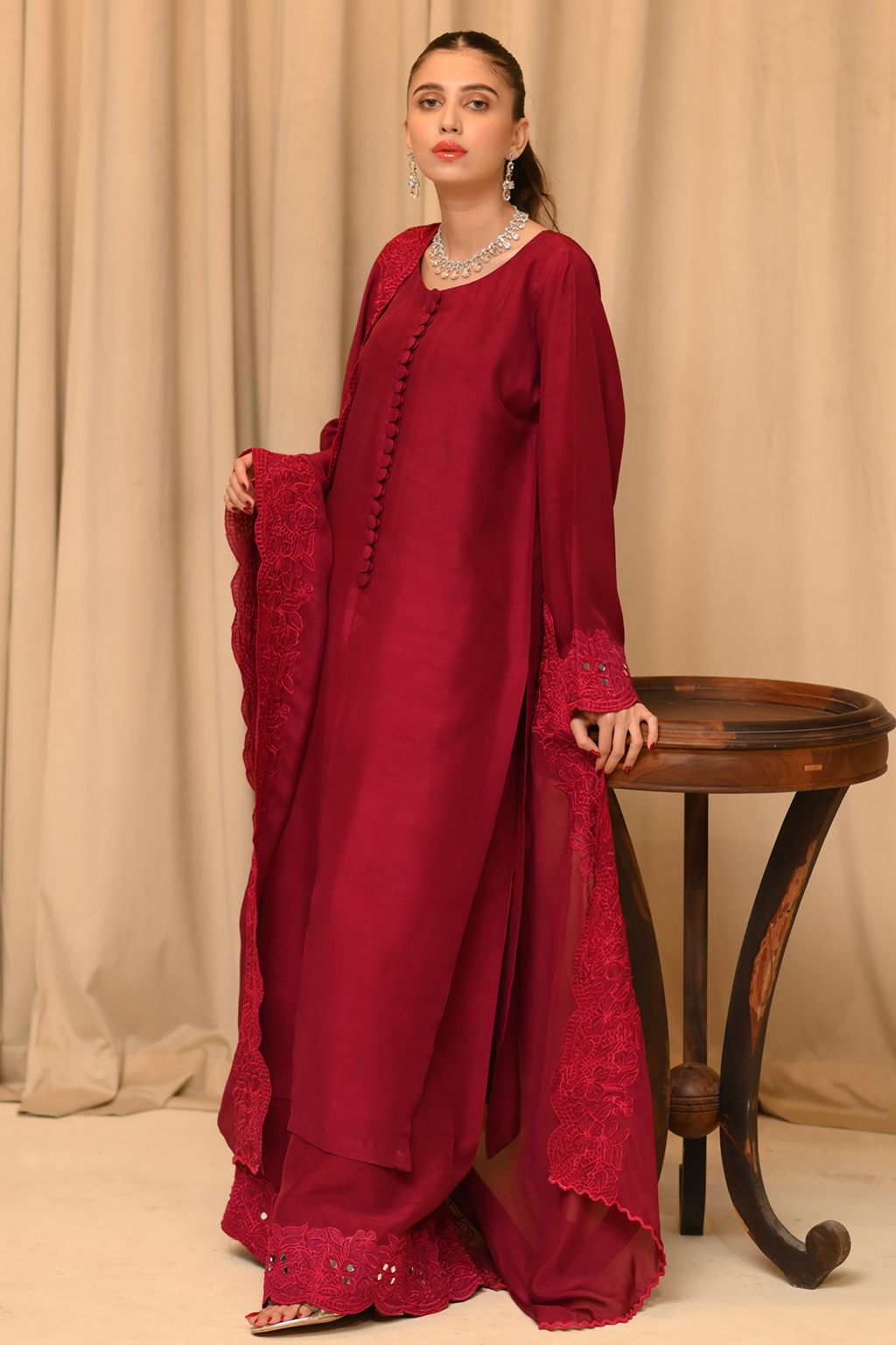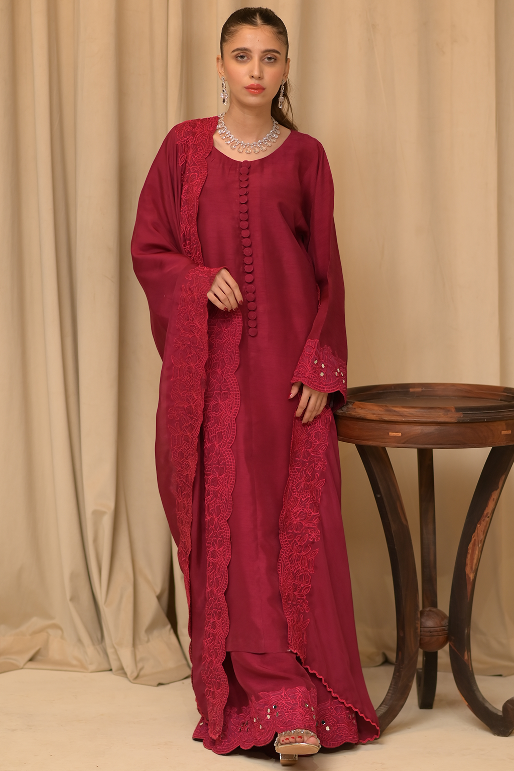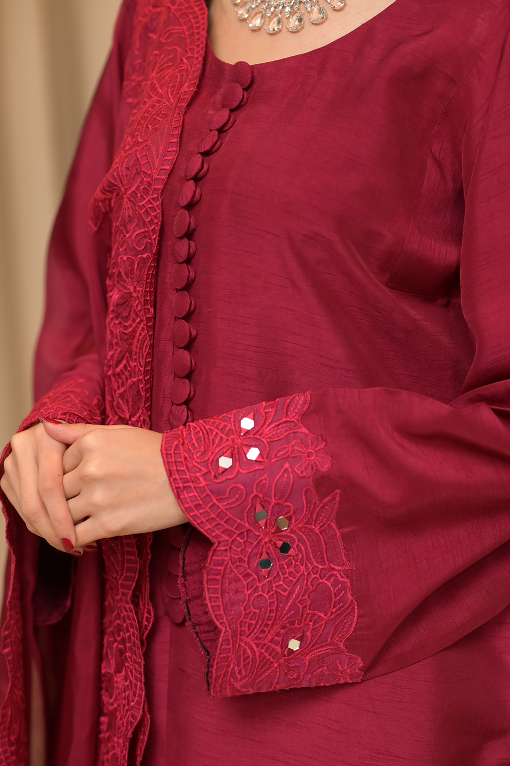 Korean rawsilk shirt and pants with silk dupatta. Thread embroidery and sheesha work.