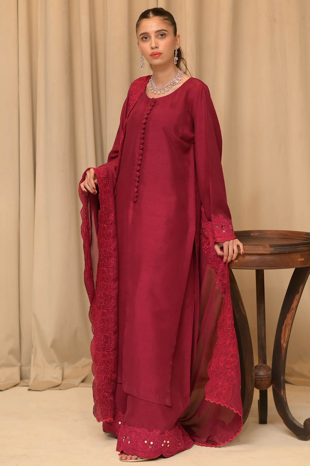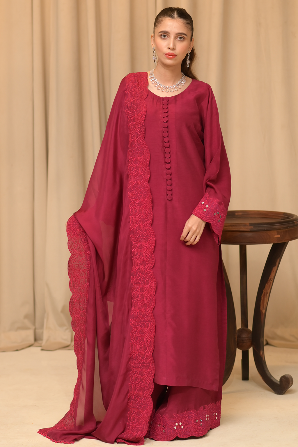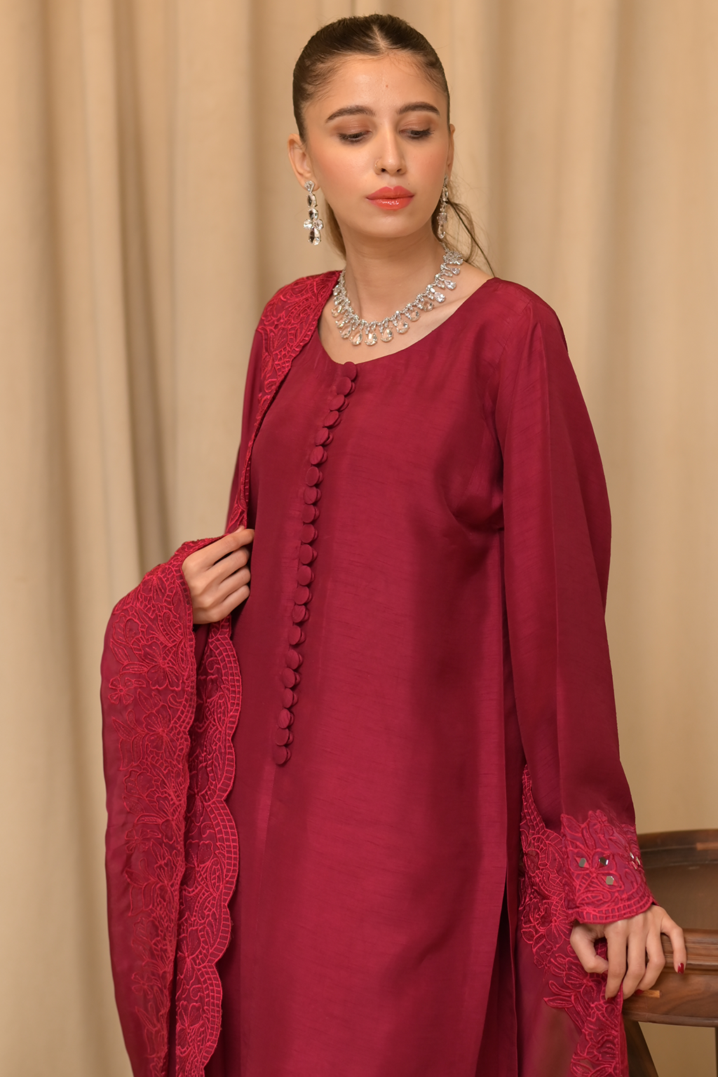 Korean rawsilk shirt and pants with silk dupatta. Thread embroidery and sheesha work.