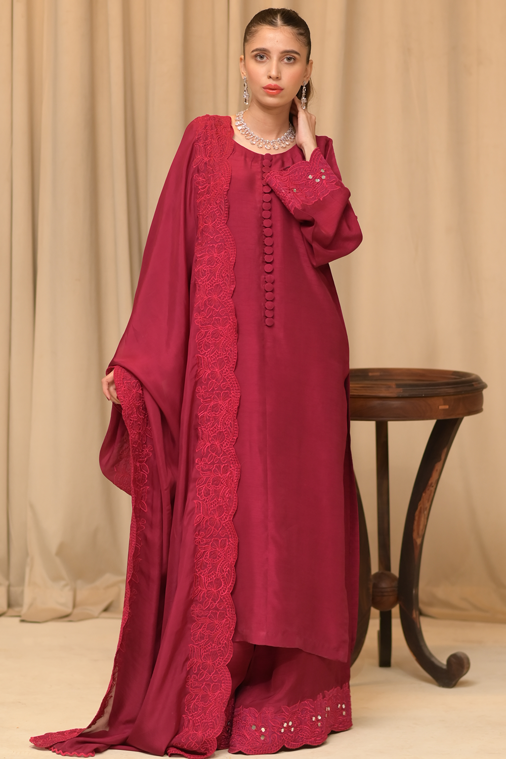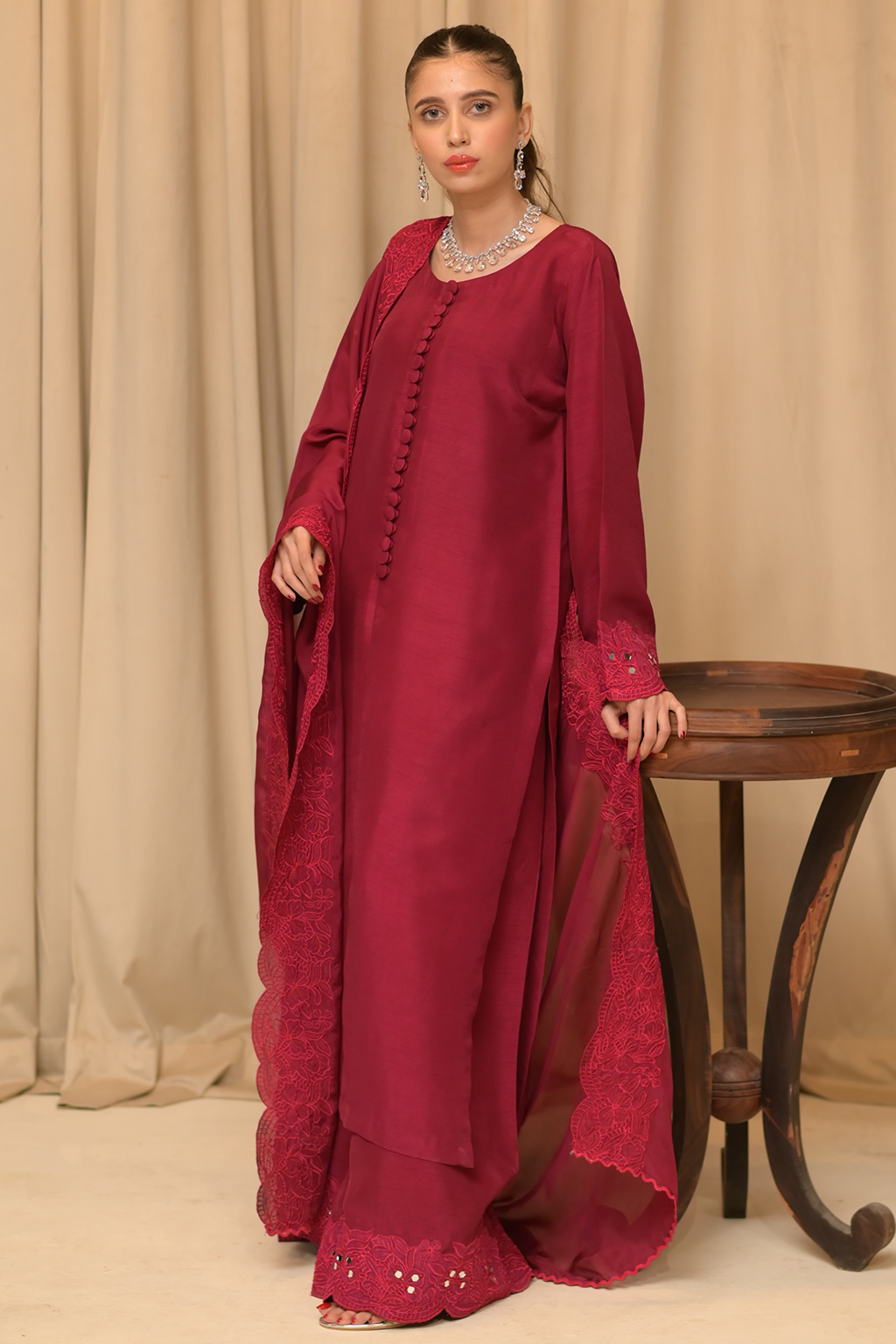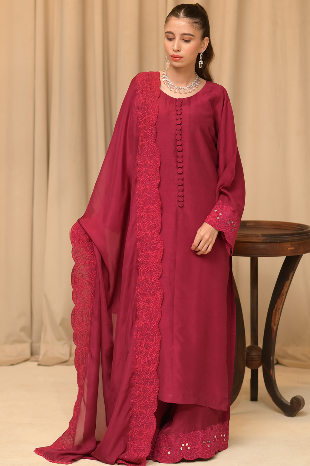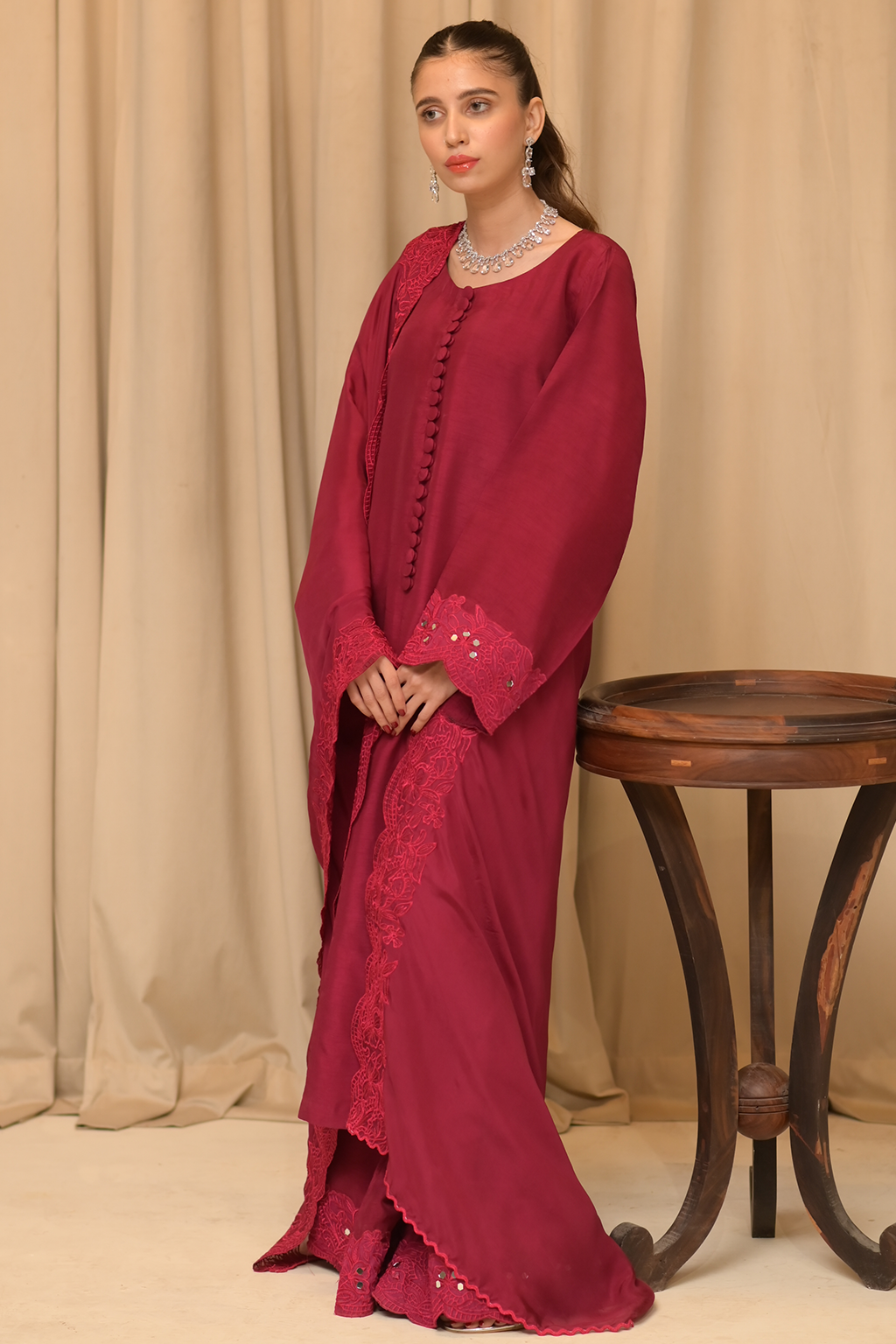 Korean rawsilk shirt and pants with silk dupatta. Thread embroidery and sheesha work.