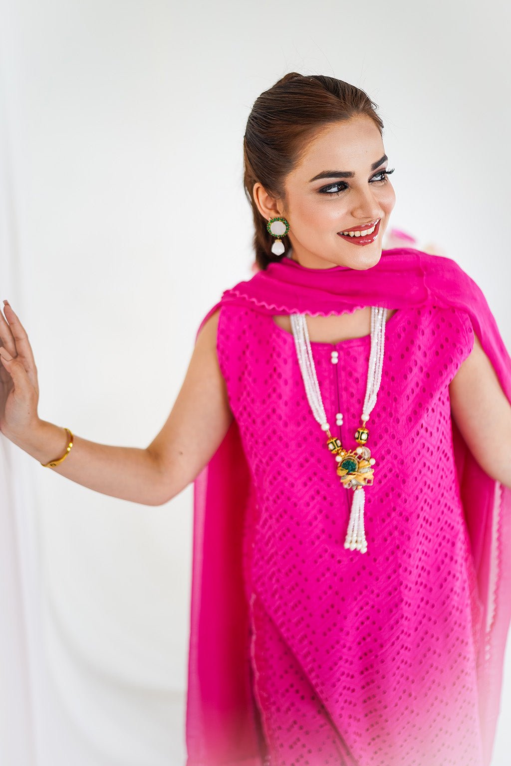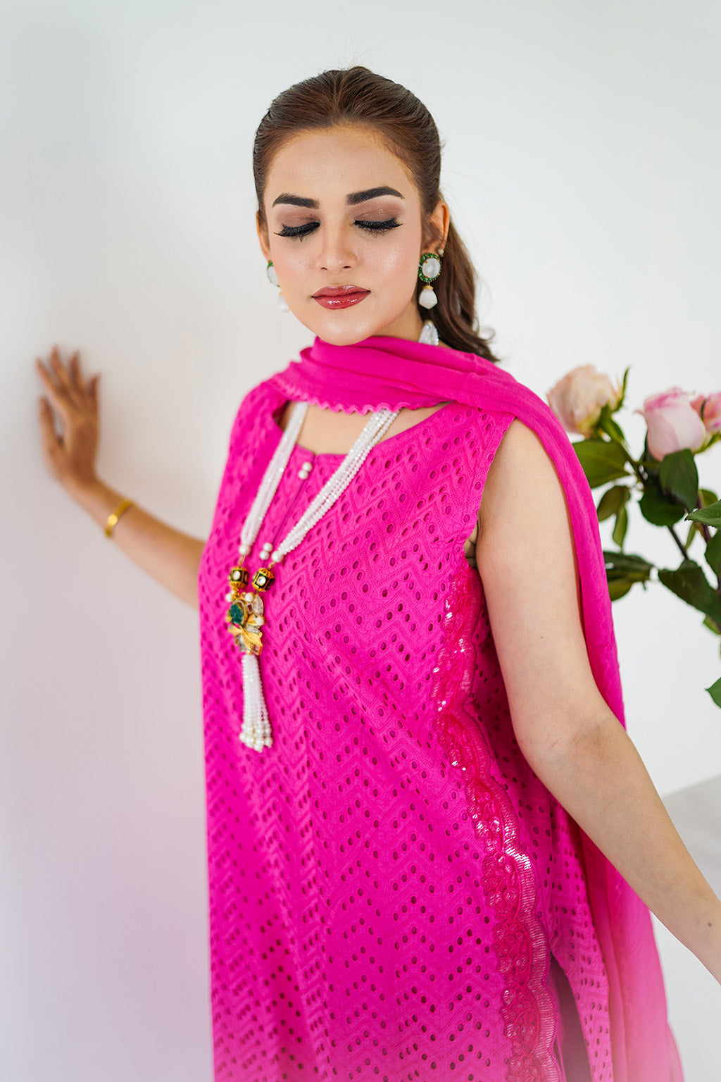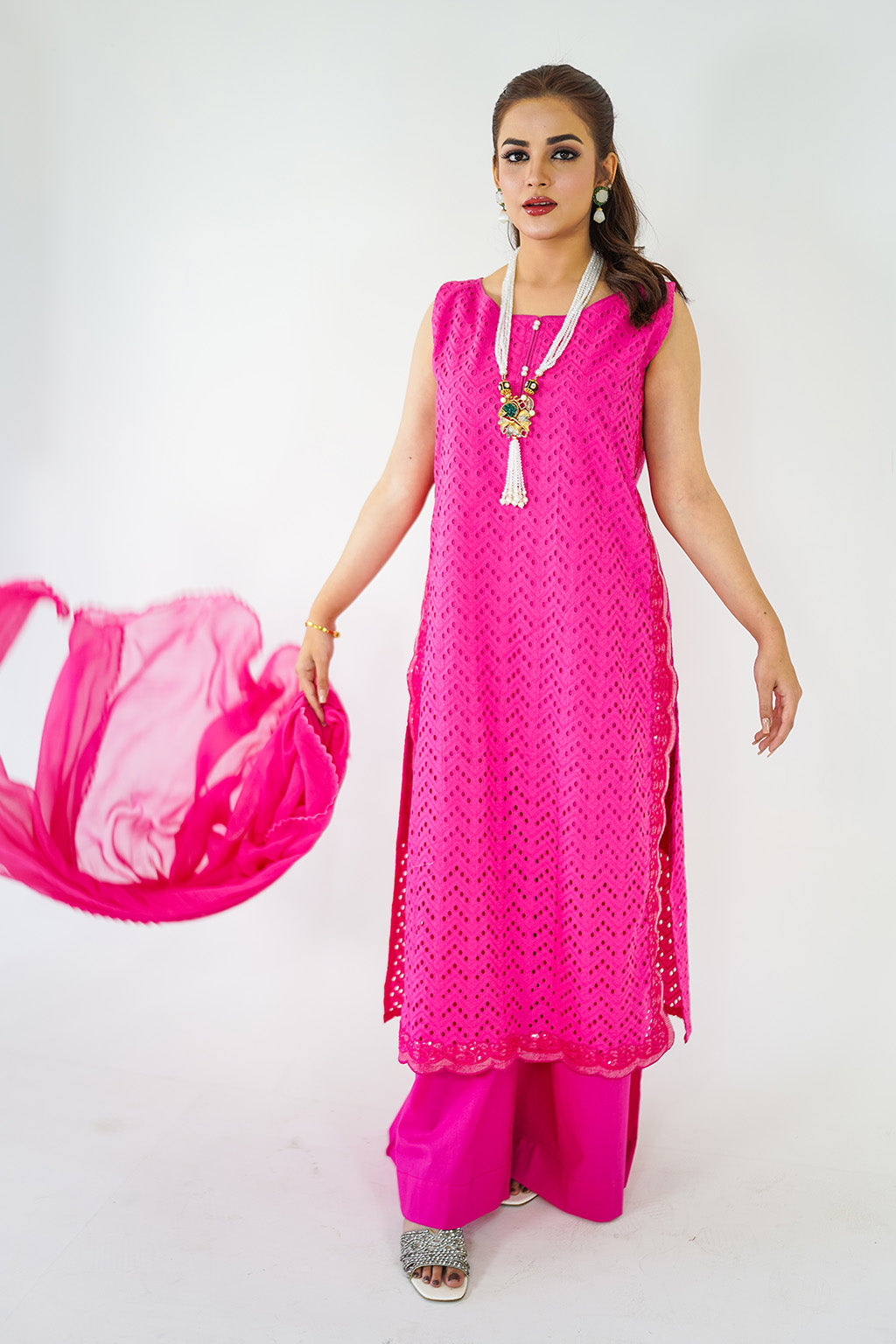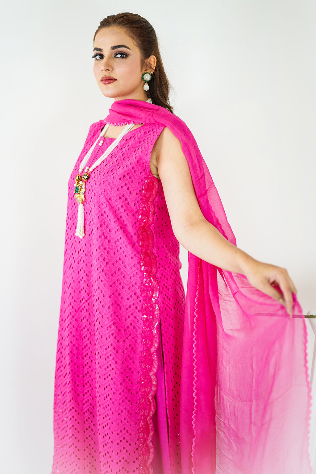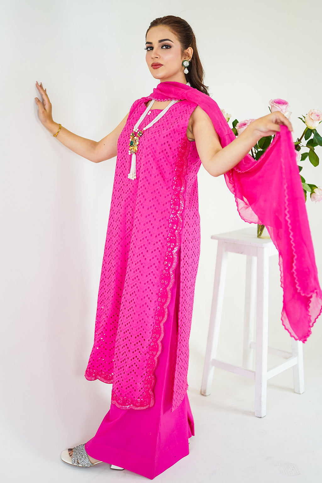 PINK PETAL - 3 - piece suit with chicken kari shirt and embellished borders with chiffon dupatta